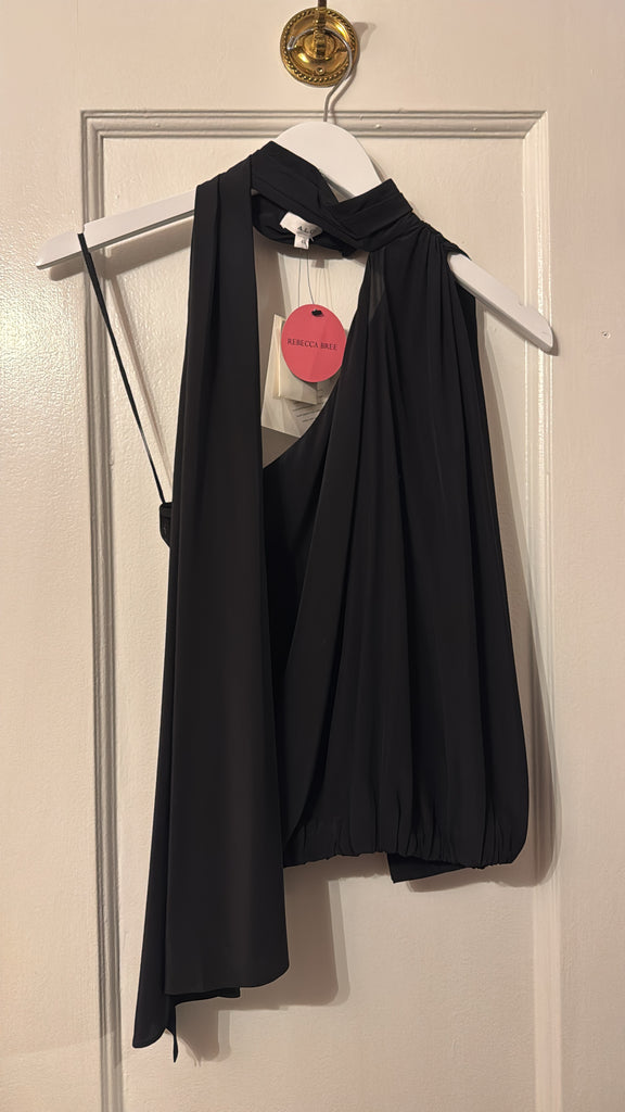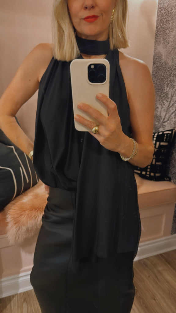 Fluid stretch silk and a sculptural draped neck scarf define this sleeveless silhouette. Featuring a subtle bubble hem, this style sits effortlessly over high-waisted skirts or tailored trousers.