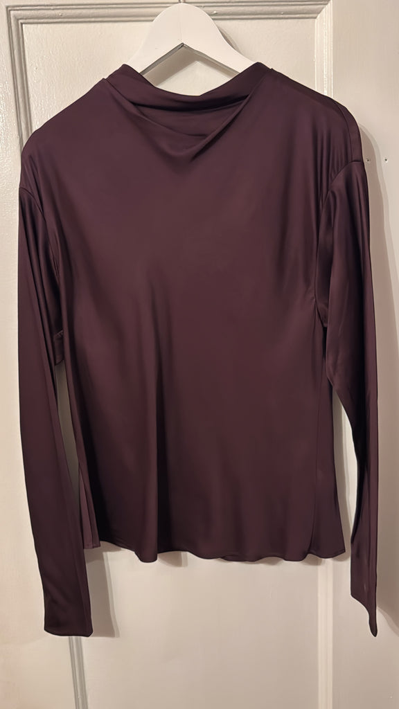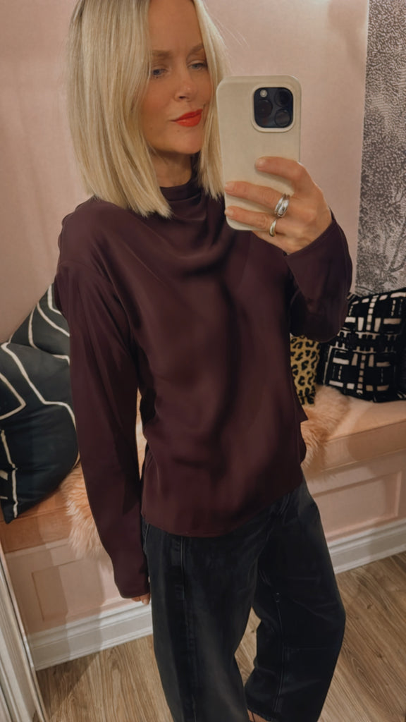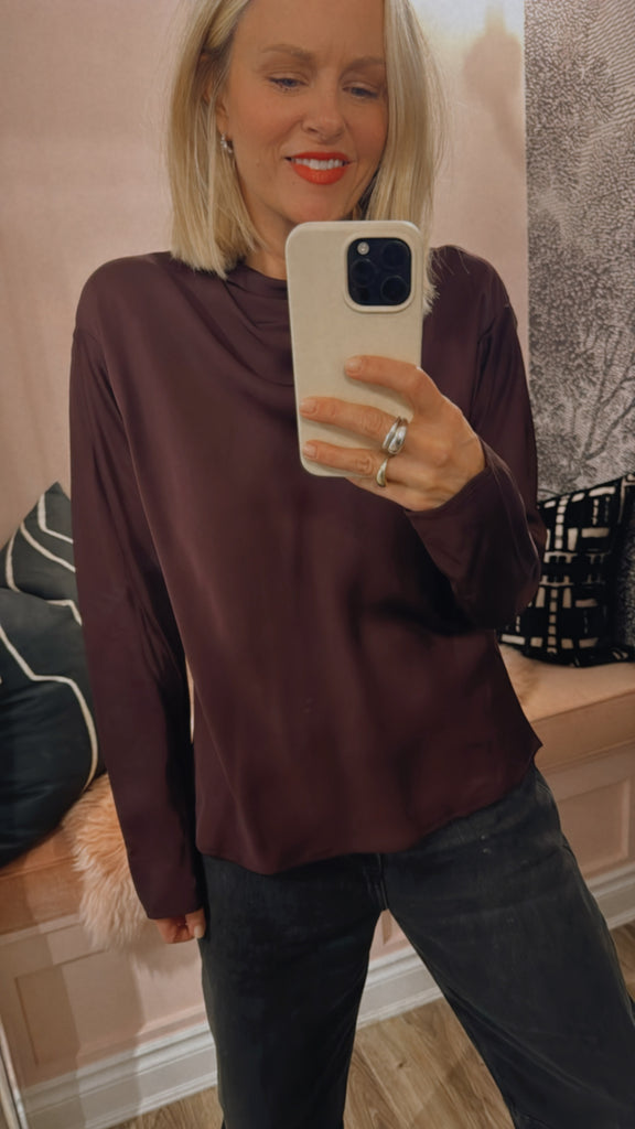 Draped in our signature fluid viscose, the Georgia Top features a subtle cowl neckline and is fastened by double tonal buttons. Pair it with sleek trousers or the Bella Skirt in matching deep plum.