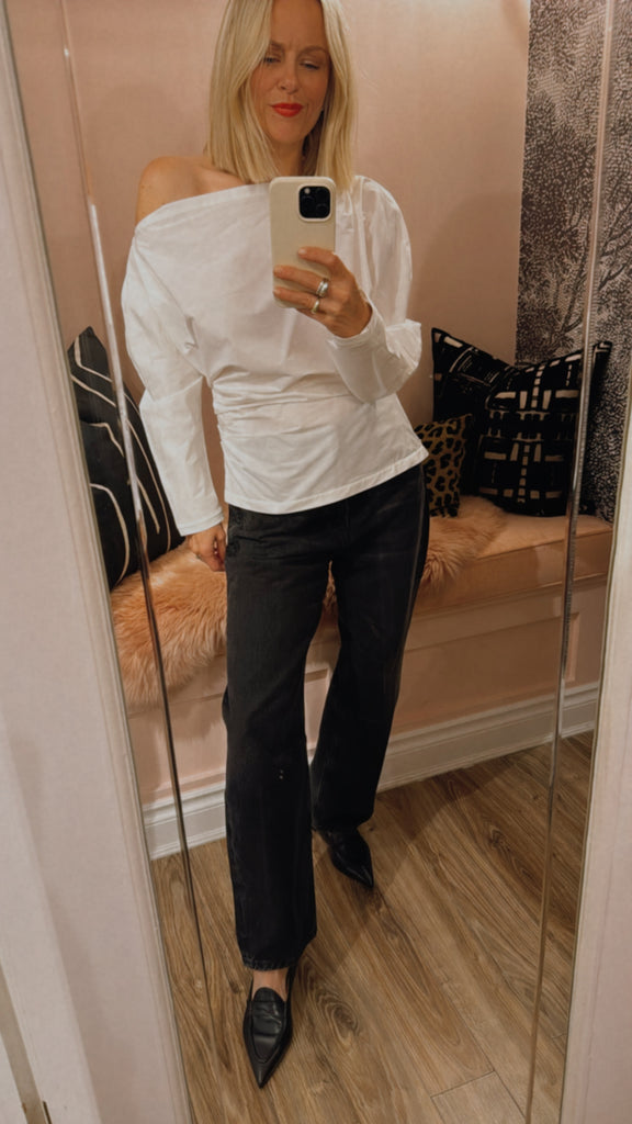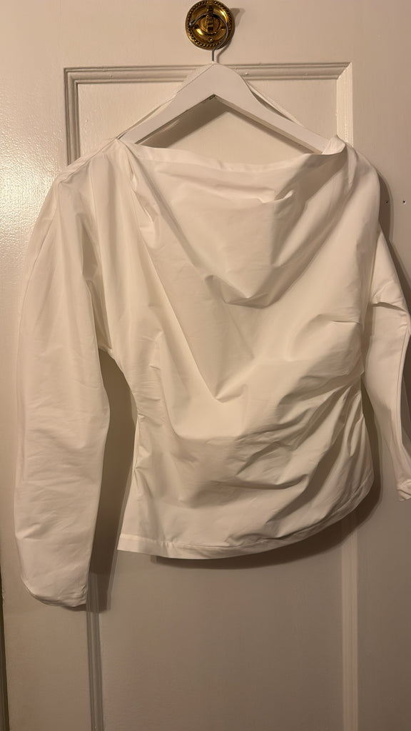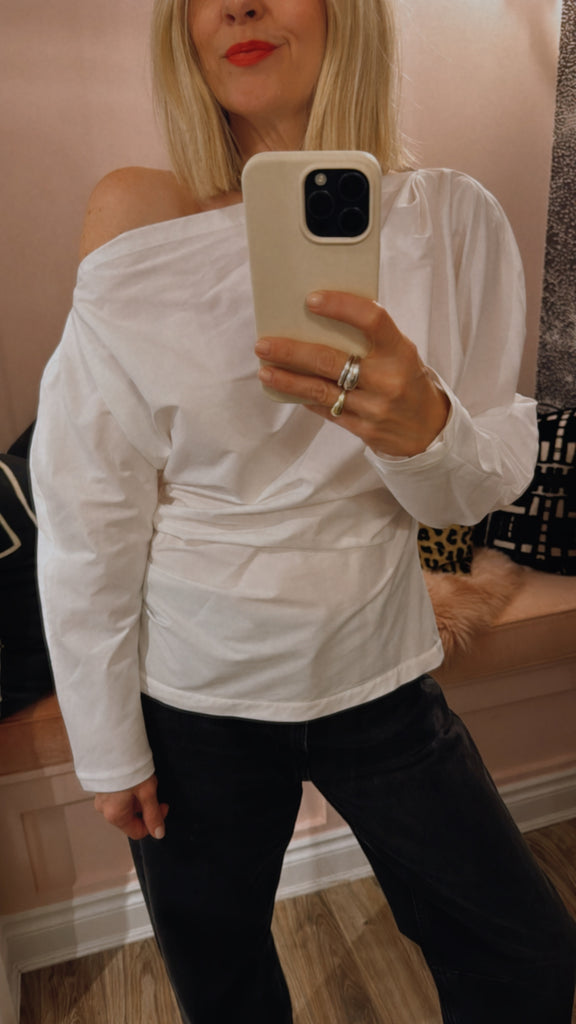 Cut from crisp stretch poplin, this off-the-shoulder silhouette, gathered sleeves, and fitted waist create soft volume.