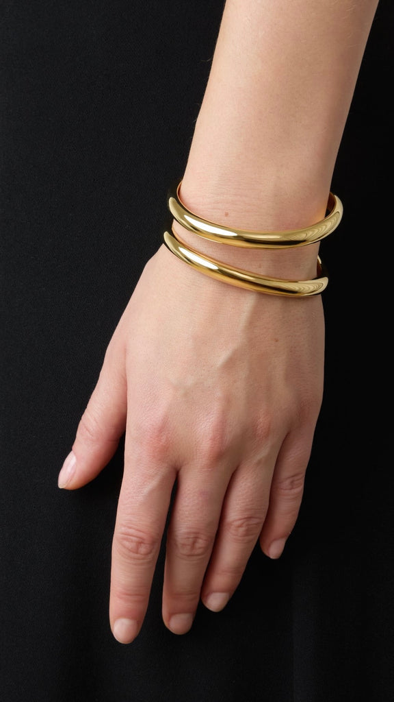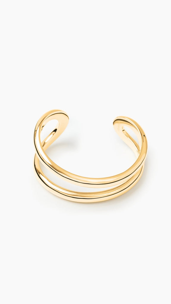 Elevate your style with the Maggie Bracelet, a refined piece that embodies curvy elegance. Crafted from 18 carat gold-plated brass, which makes it ideal for layering and offering a sophisticated touch to any outfit. Depending on how you wear it and turn it, The Maggie Bracelet can have a versatile look.