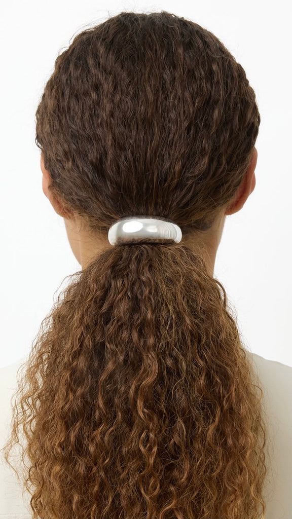 The Thea Hair Tie is redefining the classic hair tie with a voluminous yet subtle design. Crafted from silver plated brass, the Thea Hair Tie adds a noticeable and elevated look to even the simplest bun or ponytail.