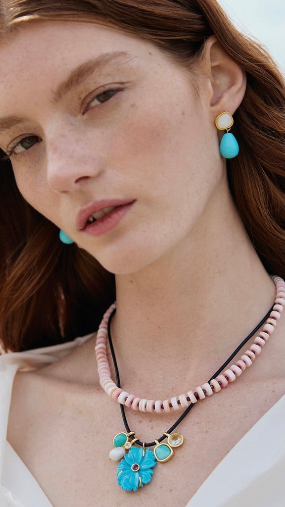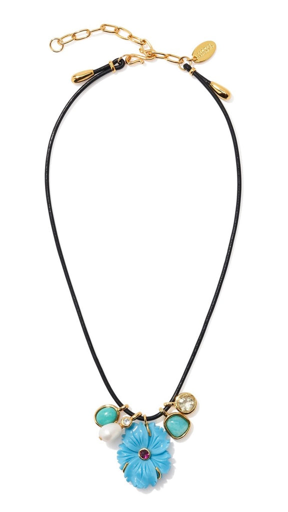 Stage a full-on charm offensive in a sleek black leather cord necklace with carved flower pendant in imitation turquoise, inset with a semiprecious rhodolite stone and flanked by a quartet of charms in Peruvian amazonite, turquoise, green amethyst, freshwater pearl and sky blue topaz.