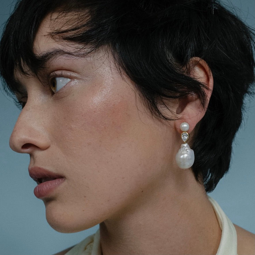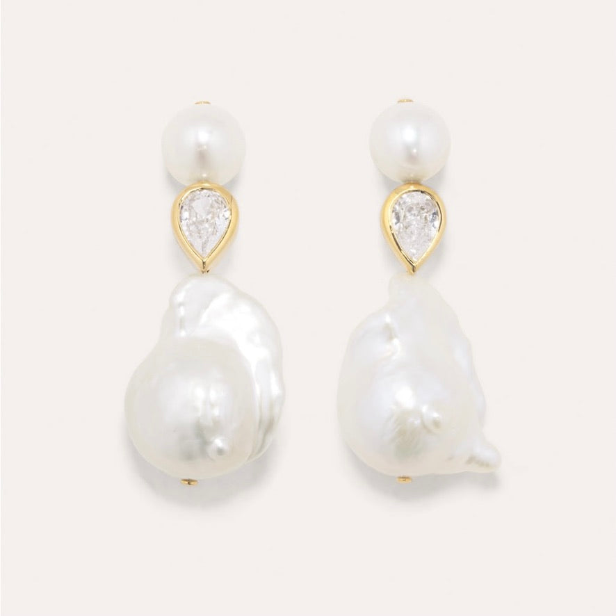 The piece is thoughtfully handcrafted using recycled sterling silver plated in 14ct yellow gold vermeil, with freshwater baroque pearl and cubic zirconia.