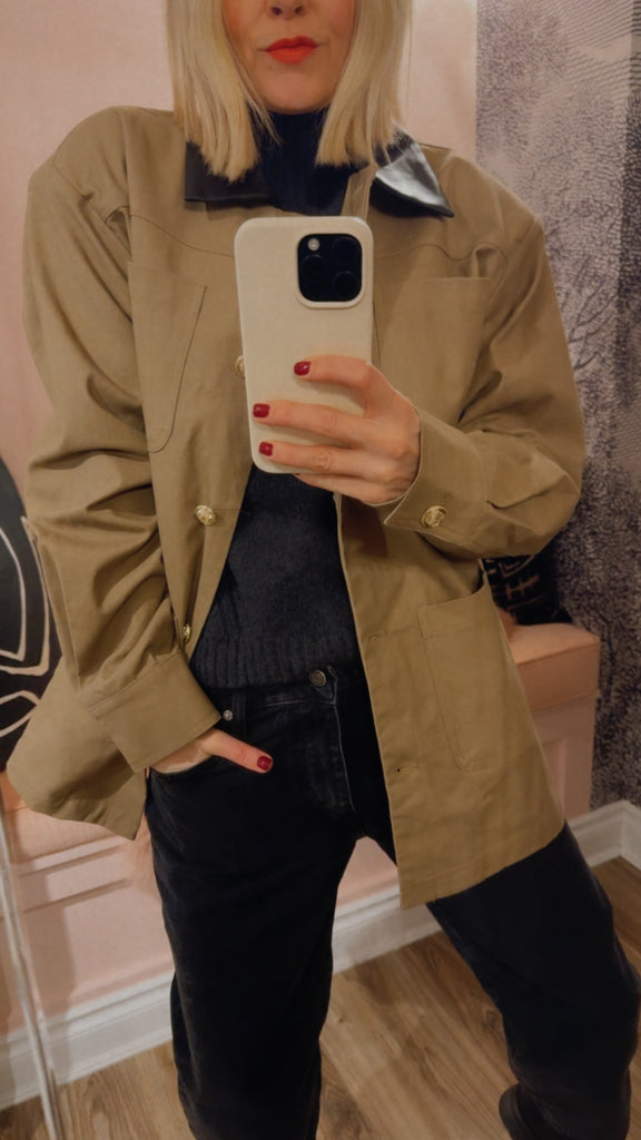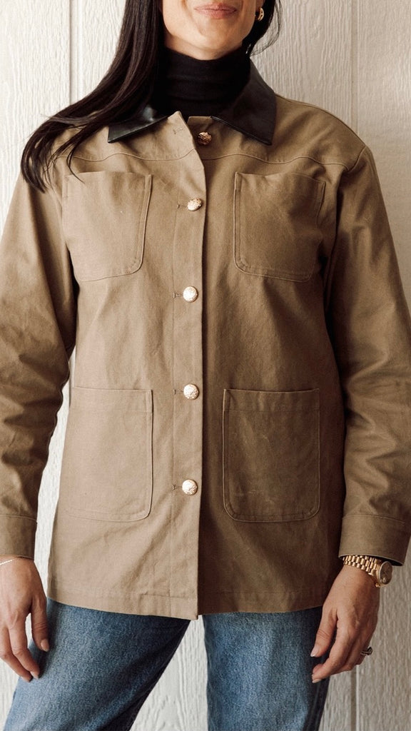 The Barn Coat is crafted from 100% cotton canvas with gold metallic crest buttons and a vegan leather collar. Designed with a relaxed, tailored fit and structured shoulders, it’s the perfect mix of polished and lived-in. Finished with patch pockets and cuff details that make it just as good rolled up as it is buttoned down. She’ll take you straight from the barn to cocktails at your favourite hotel bar.