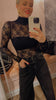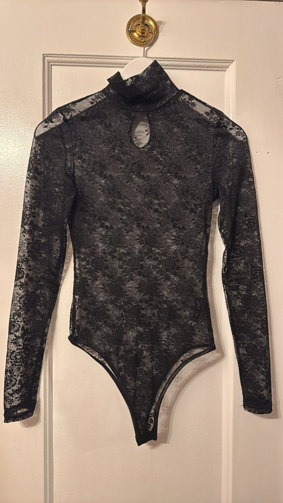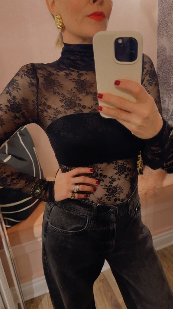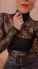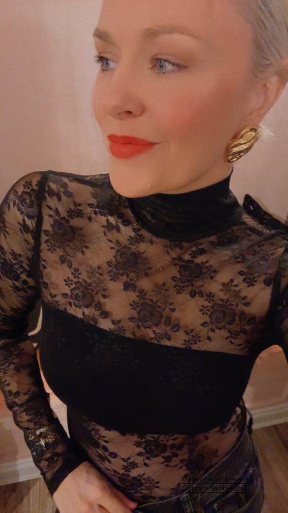 She’s made in a stretch lace with a fitted silhouette, turtle neck, and button-and-loop closure at the back of the neck. Snap button at the bottom and satin bias finishing along the hips give it a polished edge. Sheer and lightweight, it pairs perfectly under our Evie Blaze or with our matching Linda Leggings.