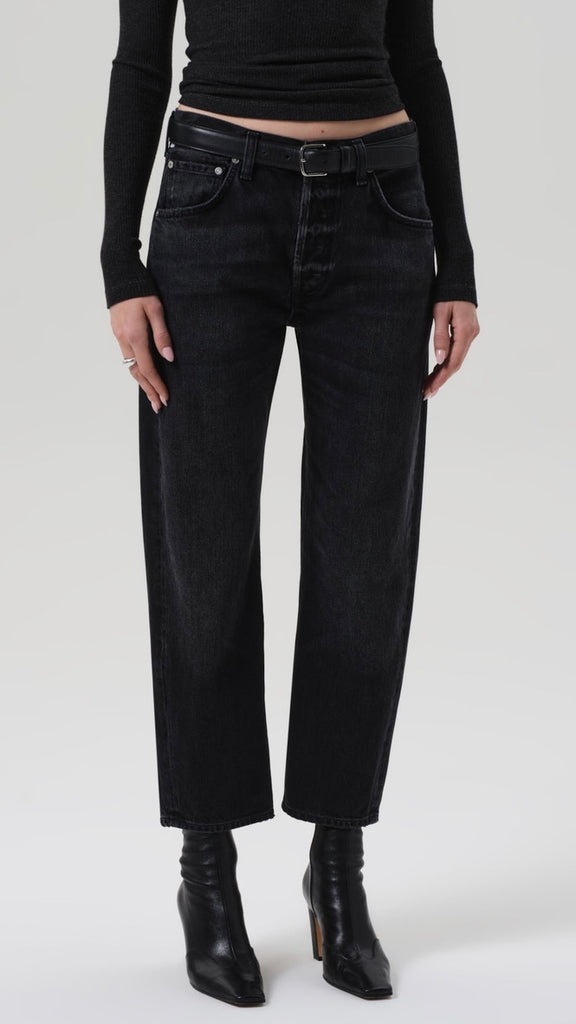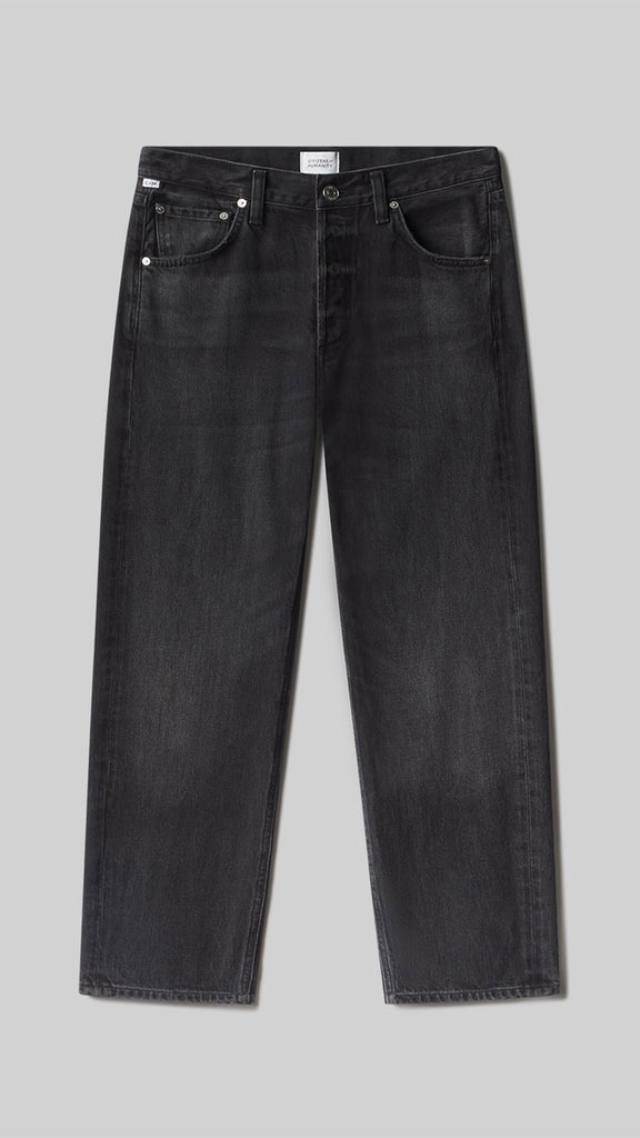 The Winslow is a modern take on the boyfriend jean, designed with a low rise and a relaxed fit through the leg. Crafted from rigid regenerative cotton with a soft hand, it holds its shape while offering an easy drape. Raine’s washed black denim gives the silhouette a softened, worn-in edge—ideal styled with everything from a boxy tee to a structured blazer.