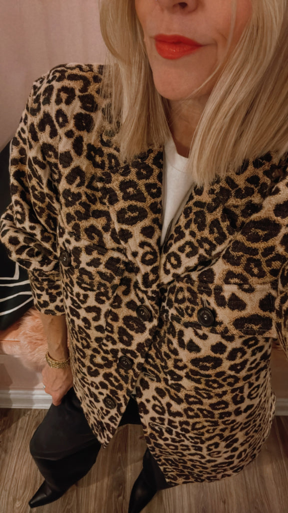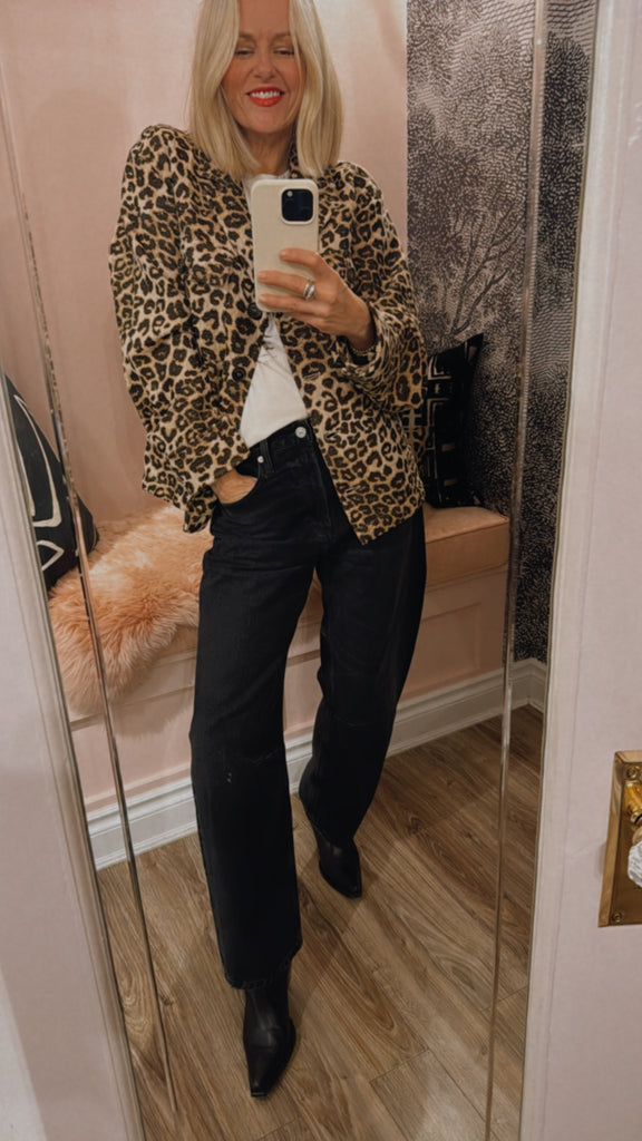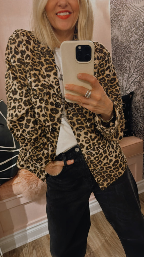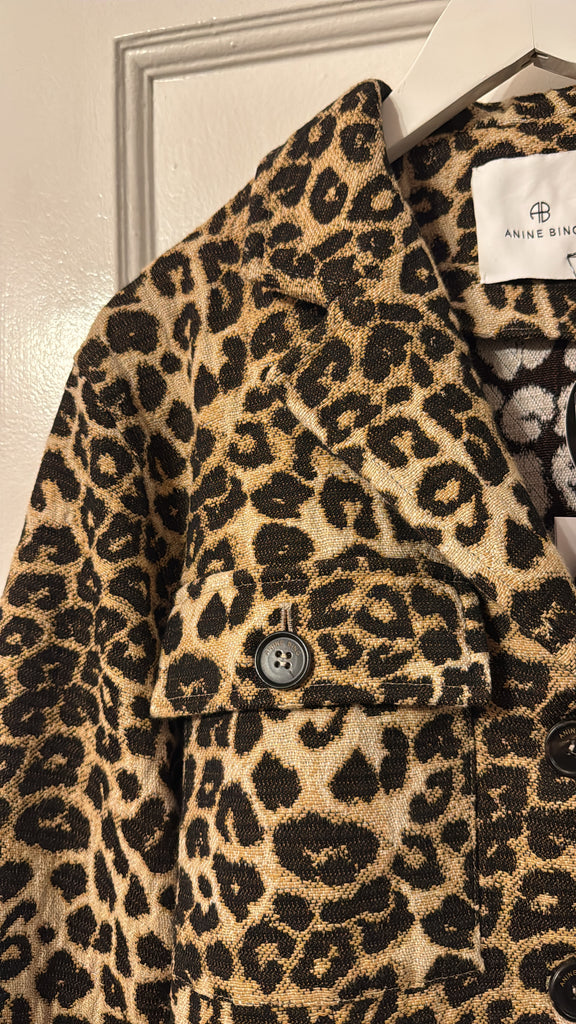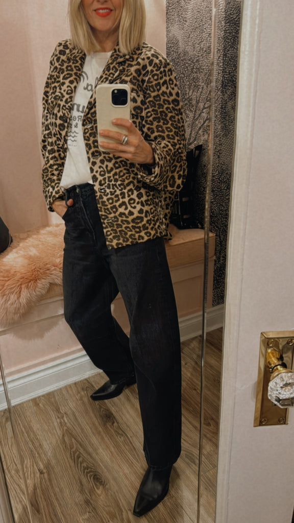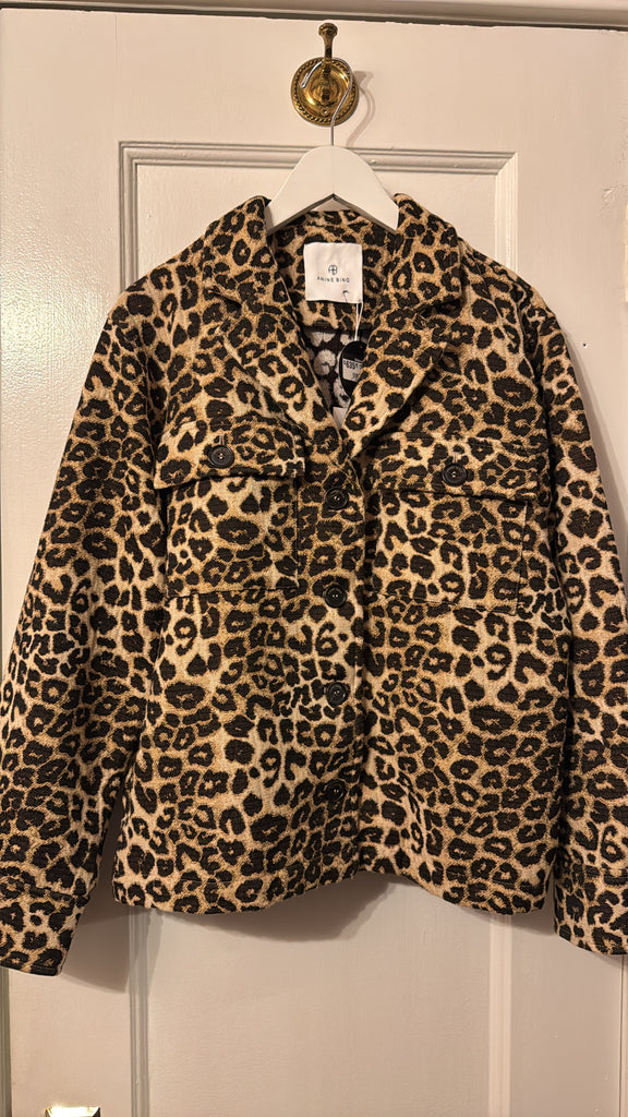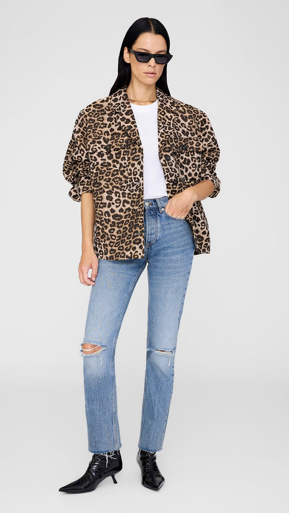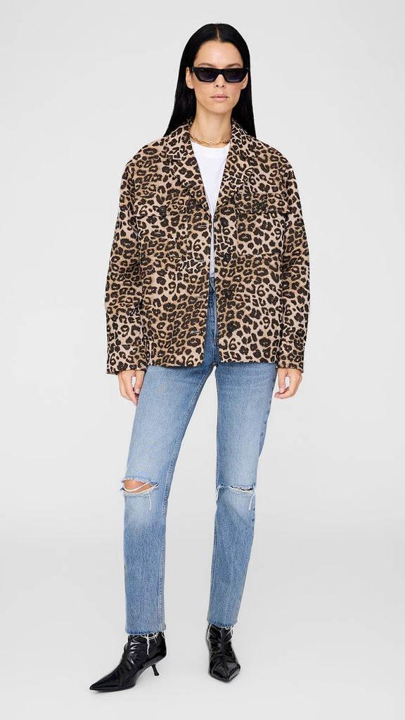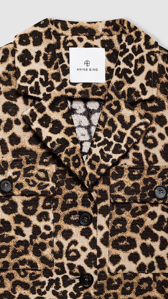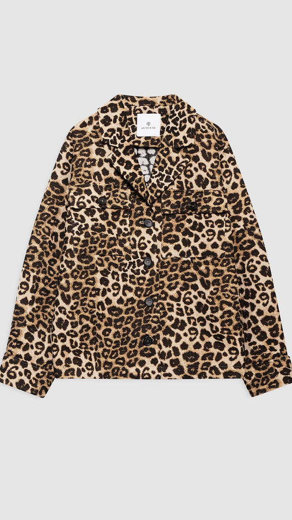 The Flynn Jacket is constructed from a light-to-midweight cotton in a vintage-inspired leopard print. Its versatile silhouette features a relaxed collar, two utility patch pockets, and button closures.
