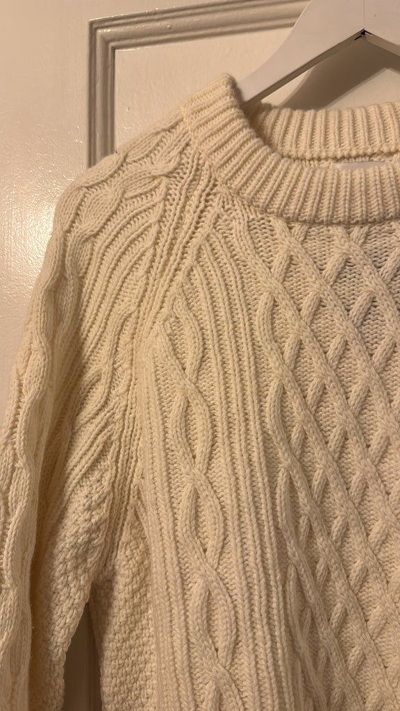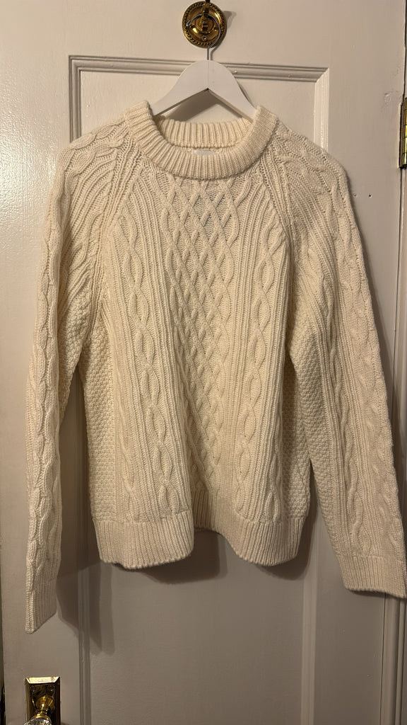 A cozy oversized fisherman sweater crafted in a midweight wool/cotton blend yarn finished with an iconic cable knit design.