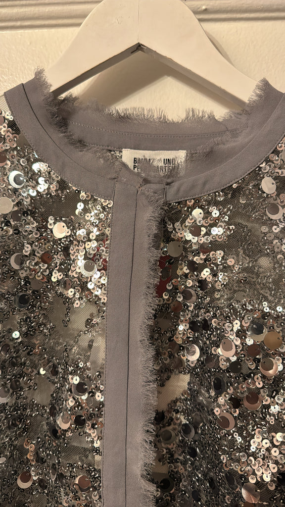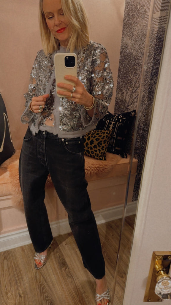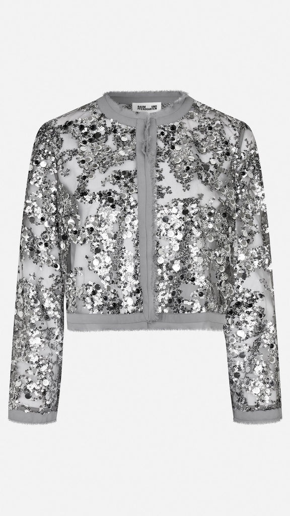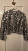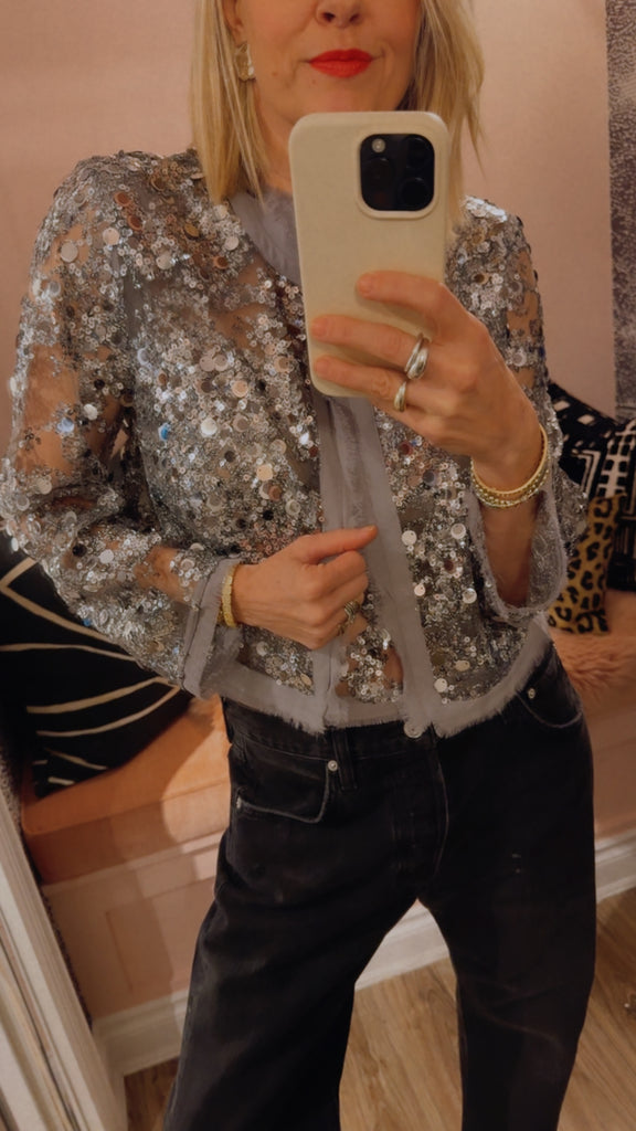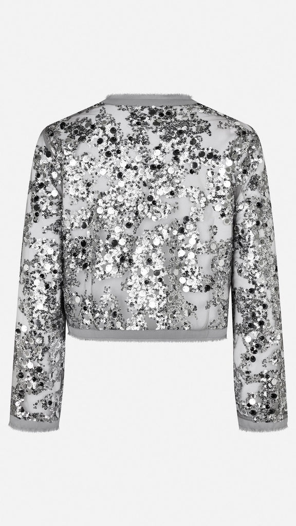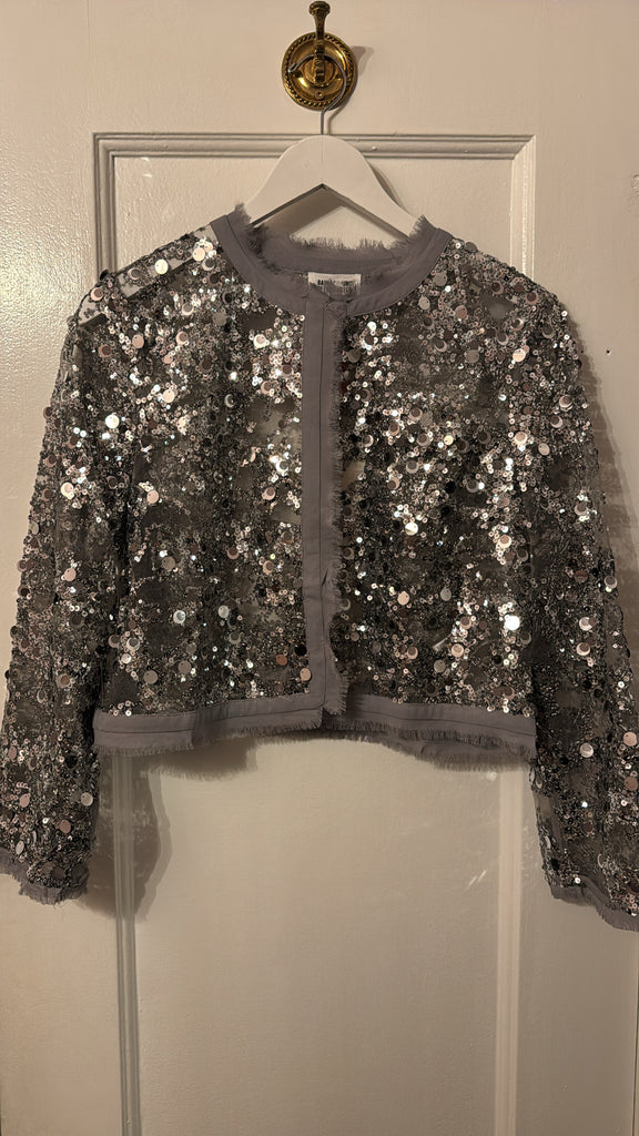 The Bethina Jacket is a cropped sequin jacket. The sheer jacket has many unique details such as a hook closure, sequin detailing and frayed hems.