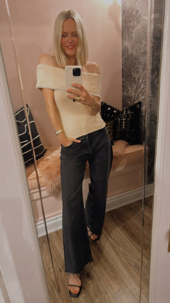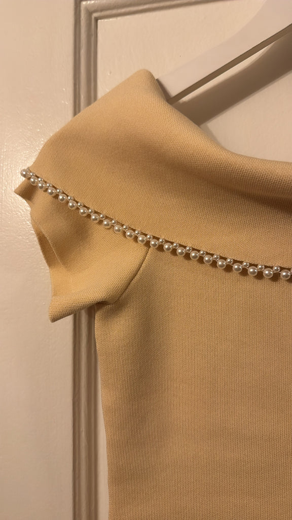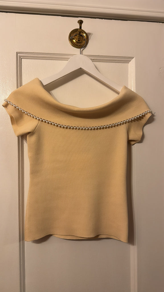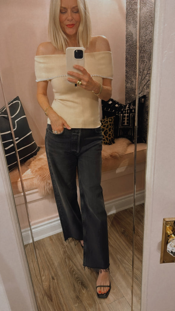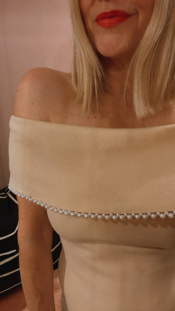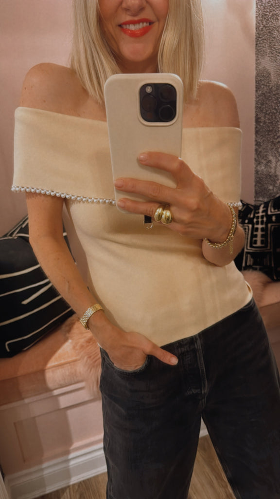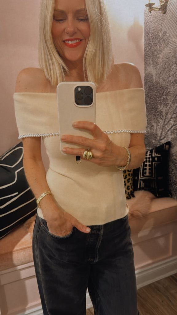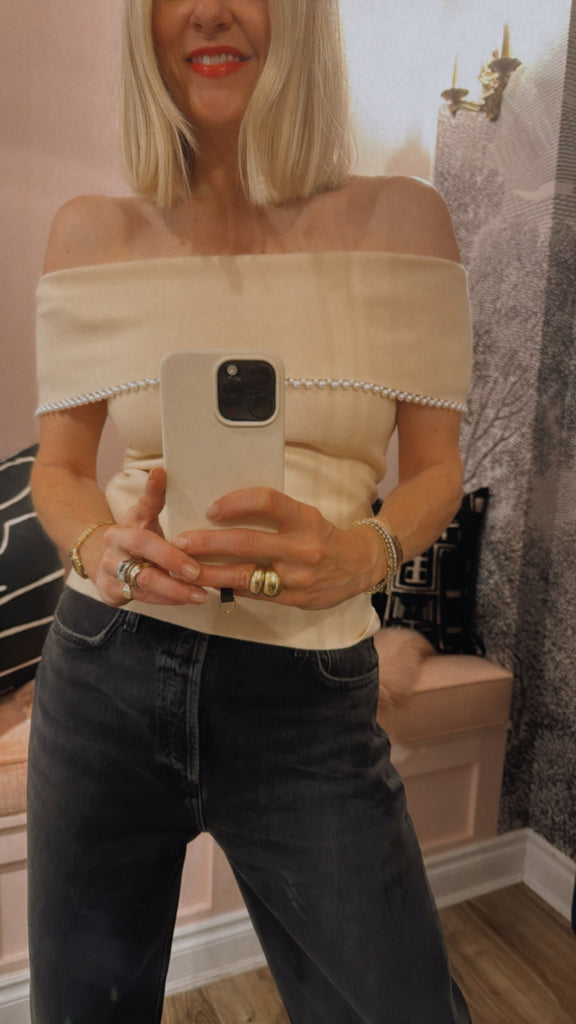 The Hetha top encapsulates the feminine elegance that By Malene Birger is known for. With its slim off-shoulder silhouette and faux pearl hem, it will instantly add sophistication year-around. Wear with voluminous bottoms to contrast the slim shape.