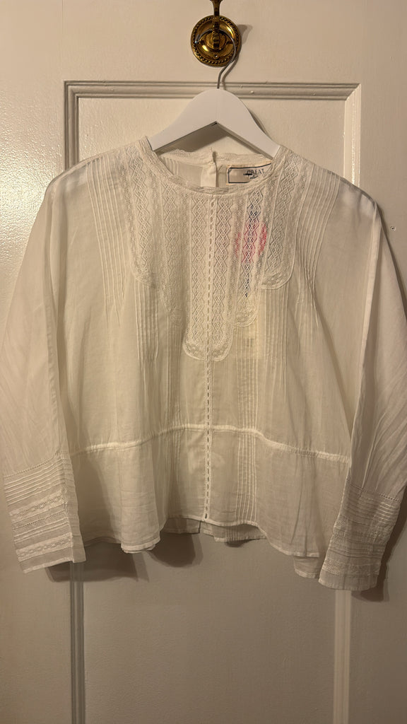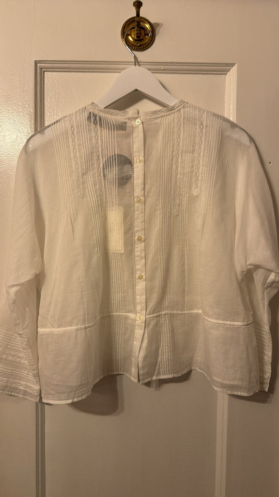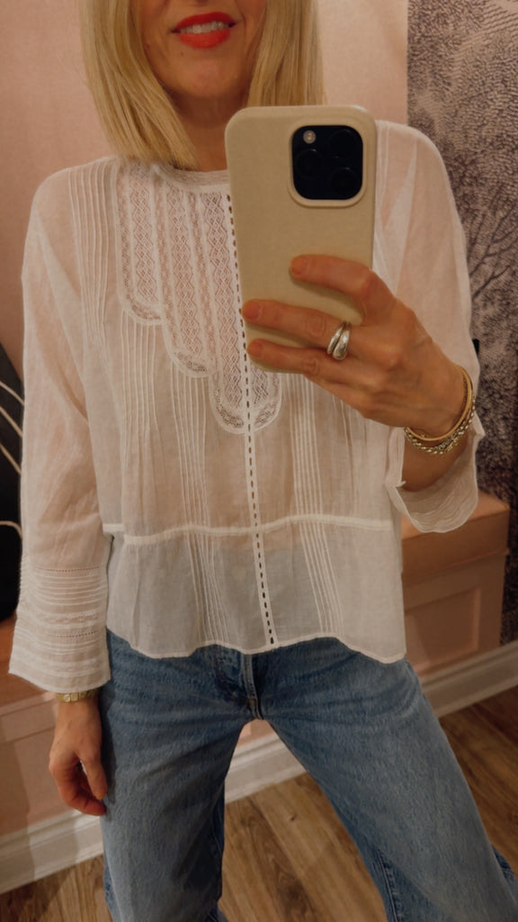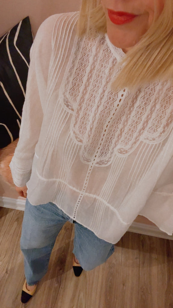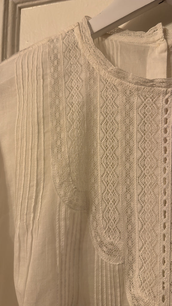 Inspired by the delicate beauty of antique heirlooms, The Victorian Top channels the romance of a bygone era with a thoroughly modern feel. Crafted from whisper-light cotton voile and adorned with intricate lace trims, it’s a piece that feels both storied and timeless. This silhouette features an interior waist channel with a slender twill tape tie—cinch it for a flattering peplum shape, or wear it loose for an easy, effortless drape. Authentic dolman sleeves fall to a clean ¾ length, offering a relaxed, graceful fit. Charming pintucks, ladder stitch detailing, lace insets, and a dainty back button placket nod to carefully collected vintage treasures. This is the kind of piece you’ll want to pass down—it’s that special.