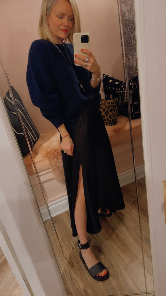 The Christina skirt is crafted from a silk blend and cut for a smooth, subtly A-line silhouette that sits mid-rise at the waist.