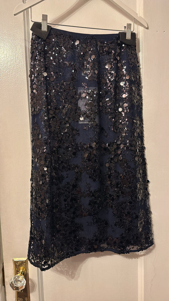 The Shania Skirt embraces the sparkle with its eye-catching sequins design. The skirt has a high waist and midi length for an elegant yet modern silhouette. It has a mesh lining underneath the sheer sequins layer for some extra coverage. The elasticated waistband ensures a comfortable fit that can be worn high or low-waisted to suit your style. When it comes to sparkle, there are no rules. Style it however you like - Go all out in our matching sequins styles or dress it down with one of our t-shirts, shirts or knitwear.