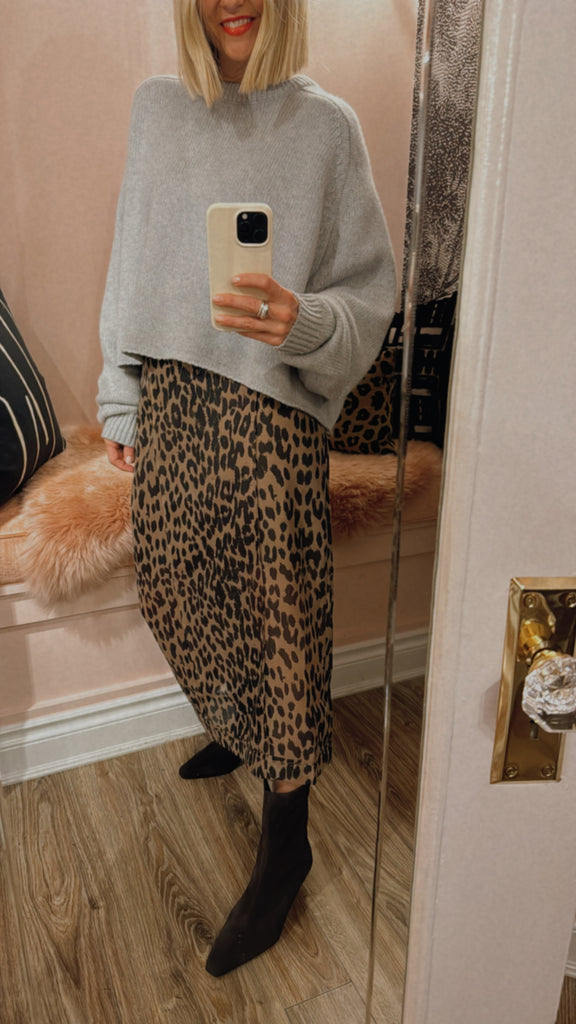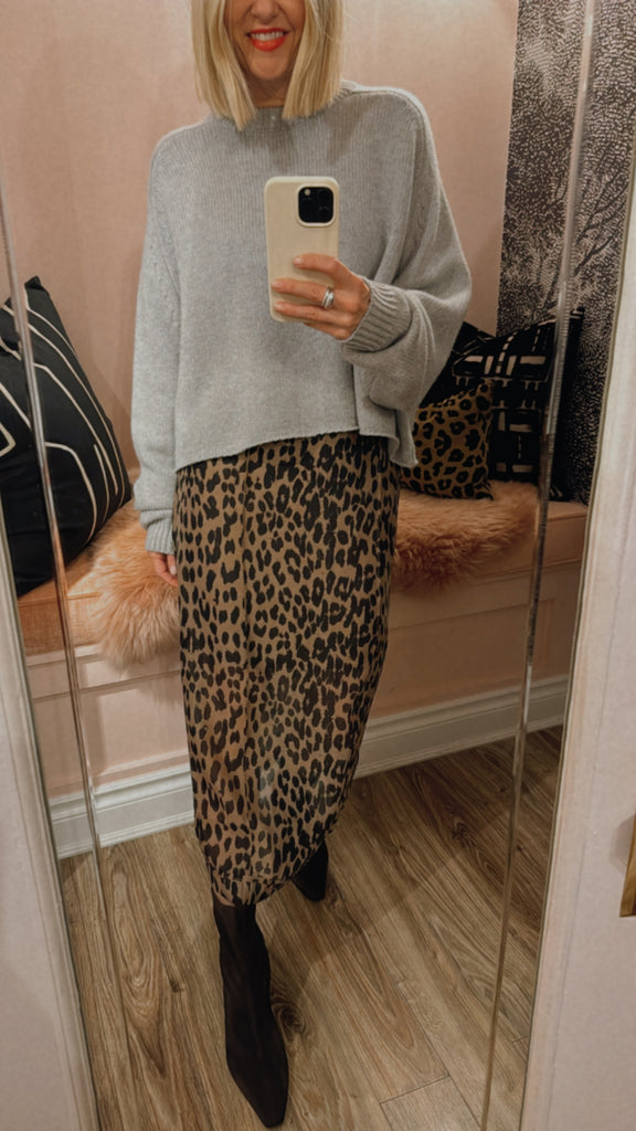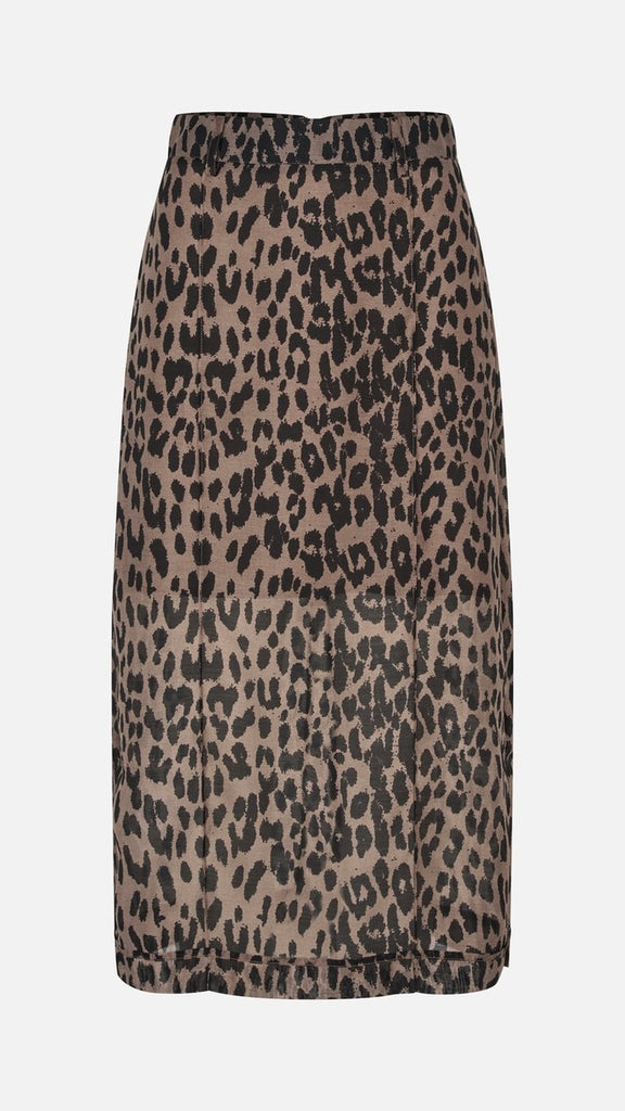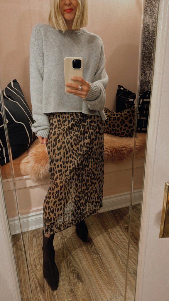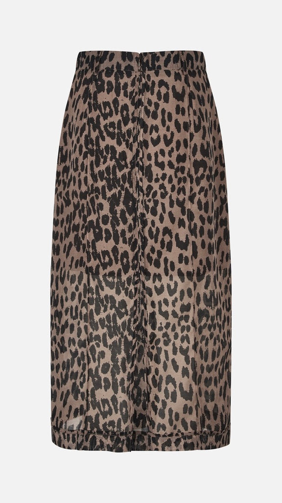 The Shevin Skirt is a statement piece made in lightweight organza with a playful leopard print. The high waist and midi length give the skirt an elegant and flowy silhouette. The skirt is lined with a miniskirt underneath the sheer printed organza for some extra coverage. It also has belt loops at the waist and a slit at the back for added movement.