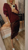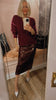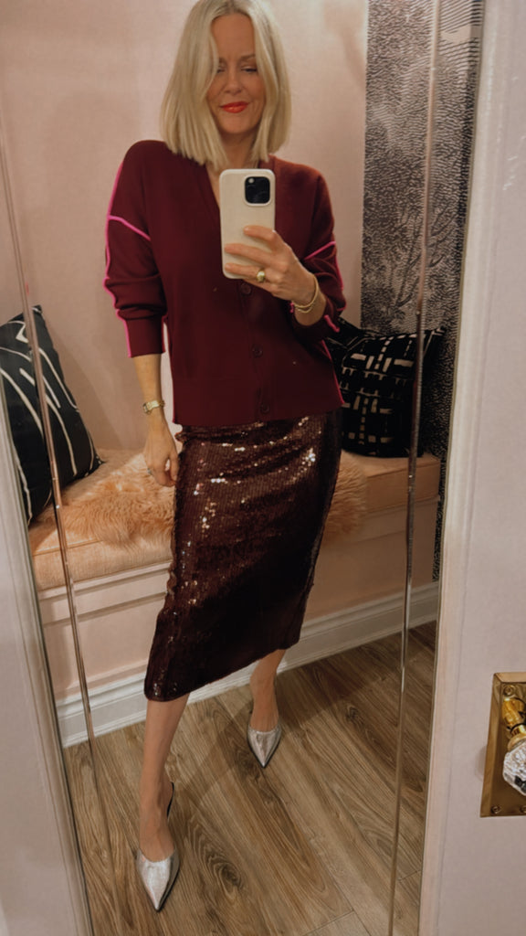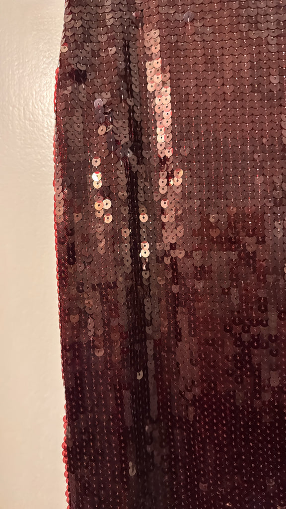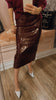 Sequins Pencil Skirt Burgundy is designed with a fitted silhouette and midi length. The skirt is fully covered in shimmering sequins and features a back slit and zip closure.