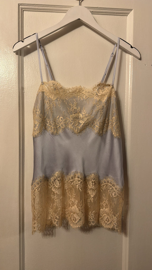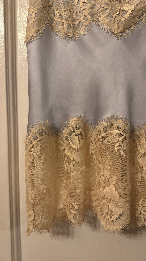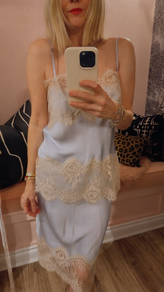 A returning favorite, designed in smooth satin with delicate lace detailing along neckline and hem. A timeless piece that transitions effortlessly from day to evening.