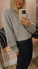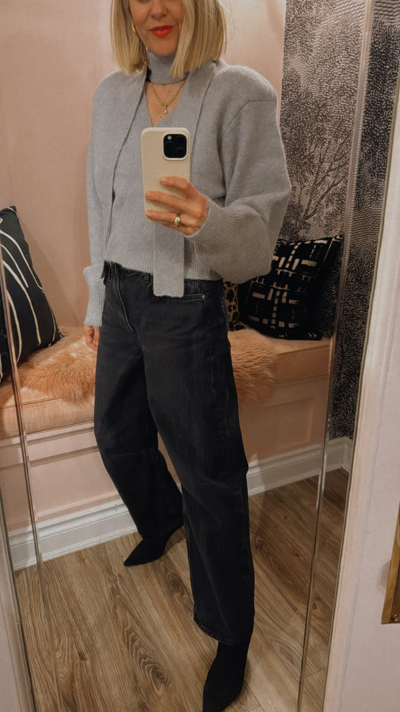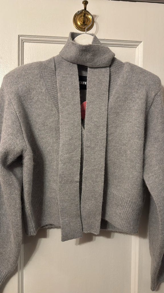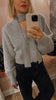 Knit Scarf Cardigan Light Grey is a slightly cropped knit cardigan with a deep V-neck, wide shoulders, and a matching removable scarf. Crafted from a soft wool and alpaca blend with ribbed hem and cuffs.