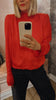 Satin Drapy Back Top is designed with a high neck and a fully open back with a wide drape detail. The back neckline is tied with a slim bow. The blouse has long sleeves and a straight fit.