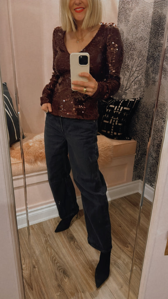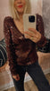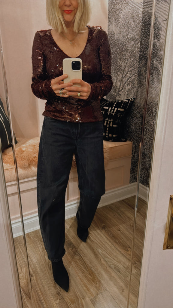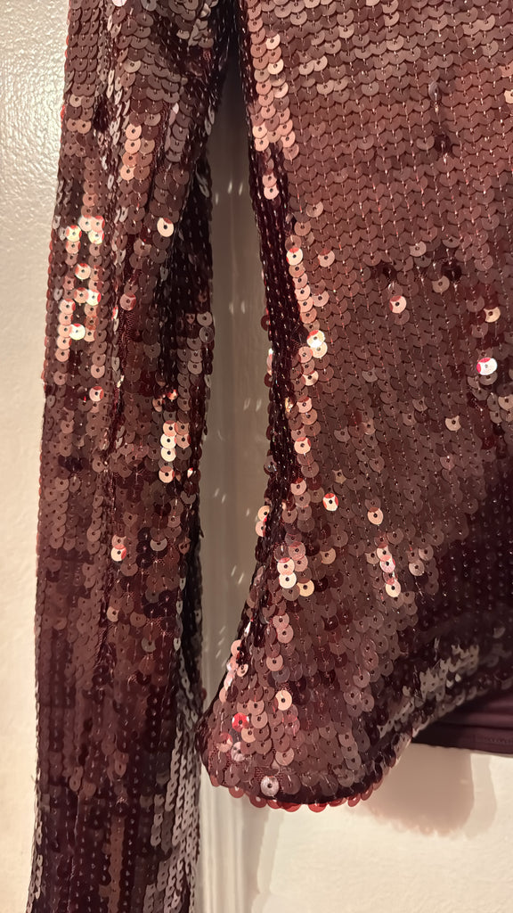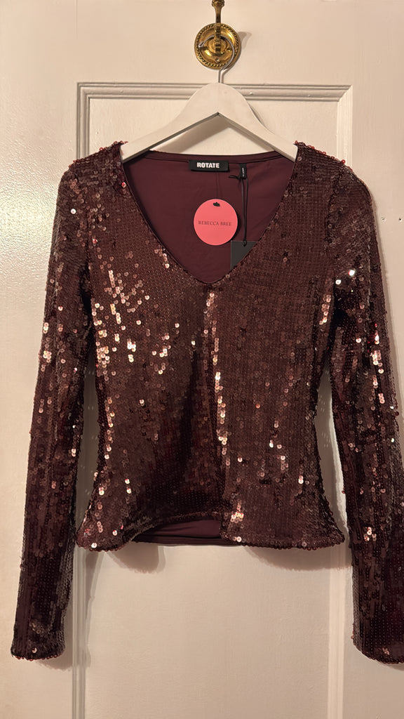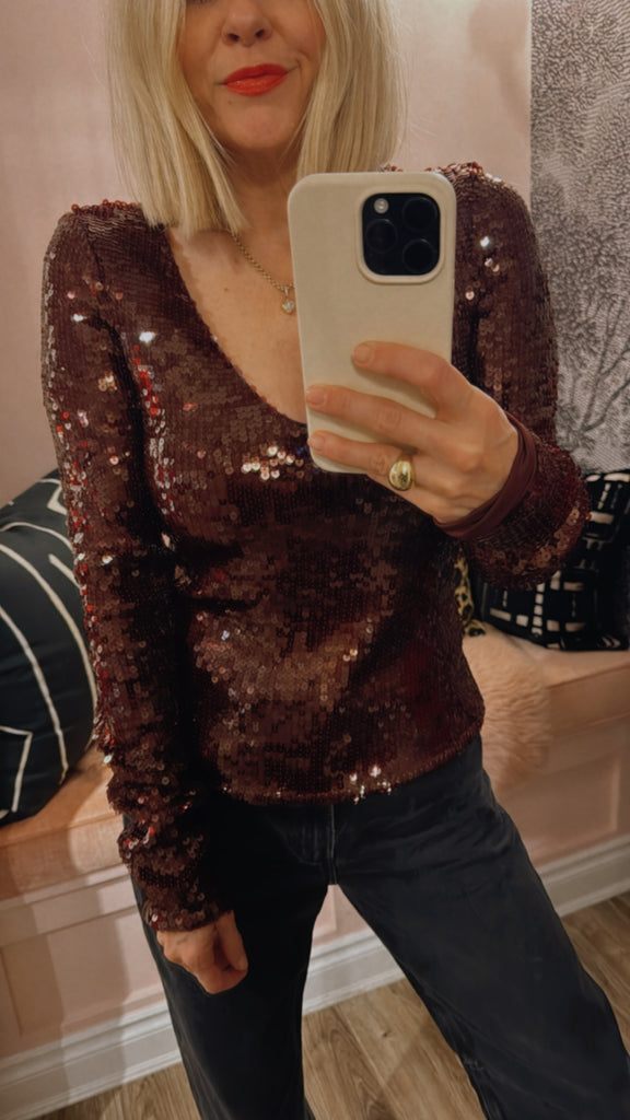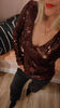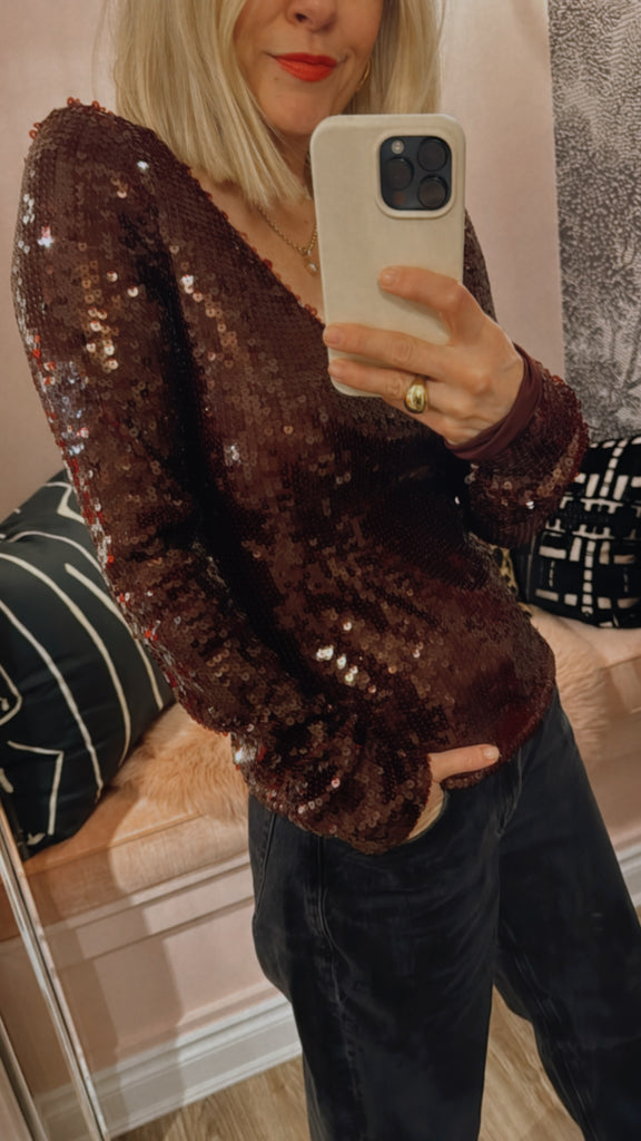 Sequins V-neck Top Zinfandel features a deep V-neckline and long fitted sleeves with a straight hem. Fully embellished with sequins, the top is cut in a slim silhouette that contours the body and offers a striking, textured surface.