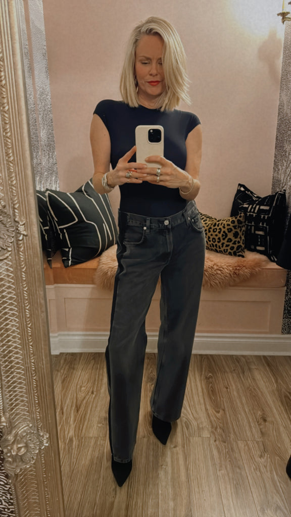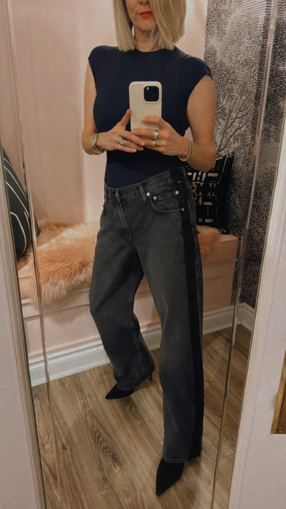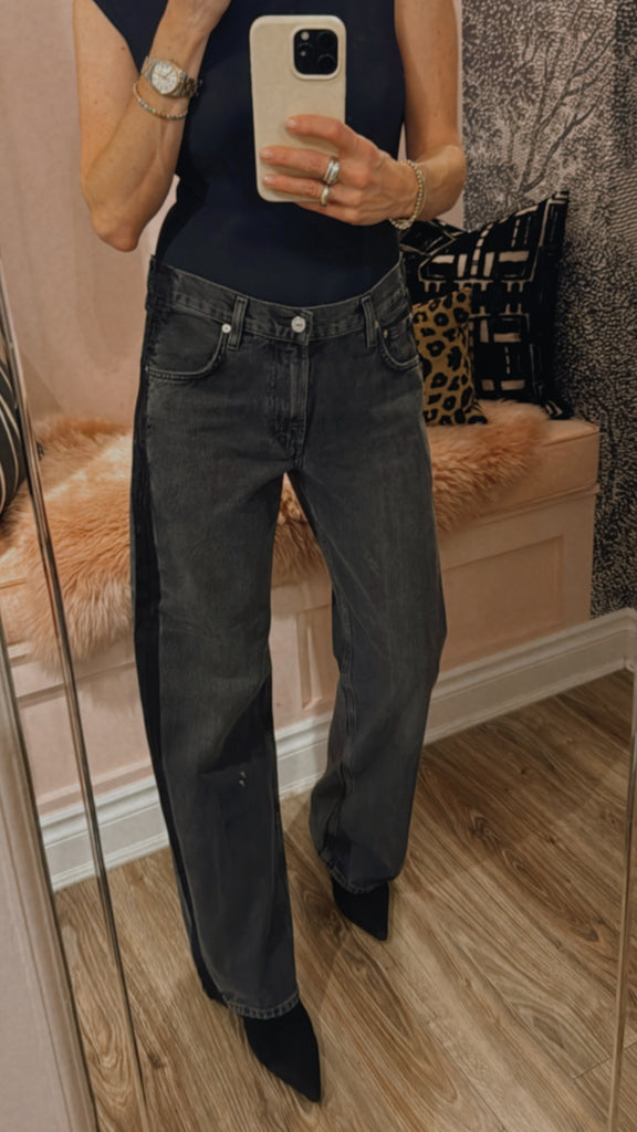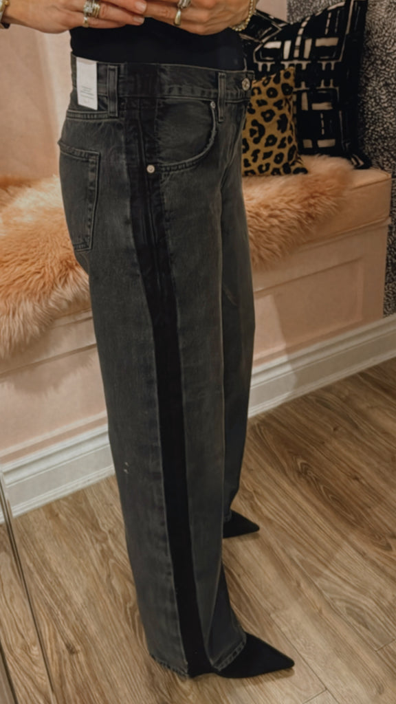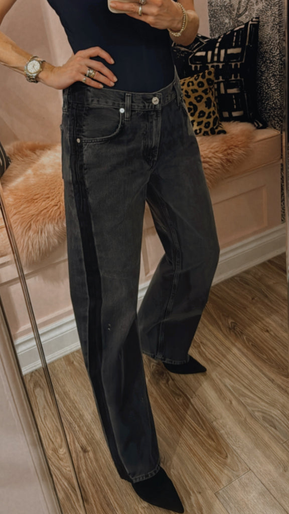 The Lindz Low Rise Easy Straight is crafted from rigid, non-stretch denim with a soft hand for all-day wearability. The washed-out black silhouette features a sleek black tuxedo stripe and subtle whiskering for a modern, polished touch. Its relaxed straight fit sits low on the waist and falls to a full-length finish, perfect paired with tees or tailored tops for versatile styling.
