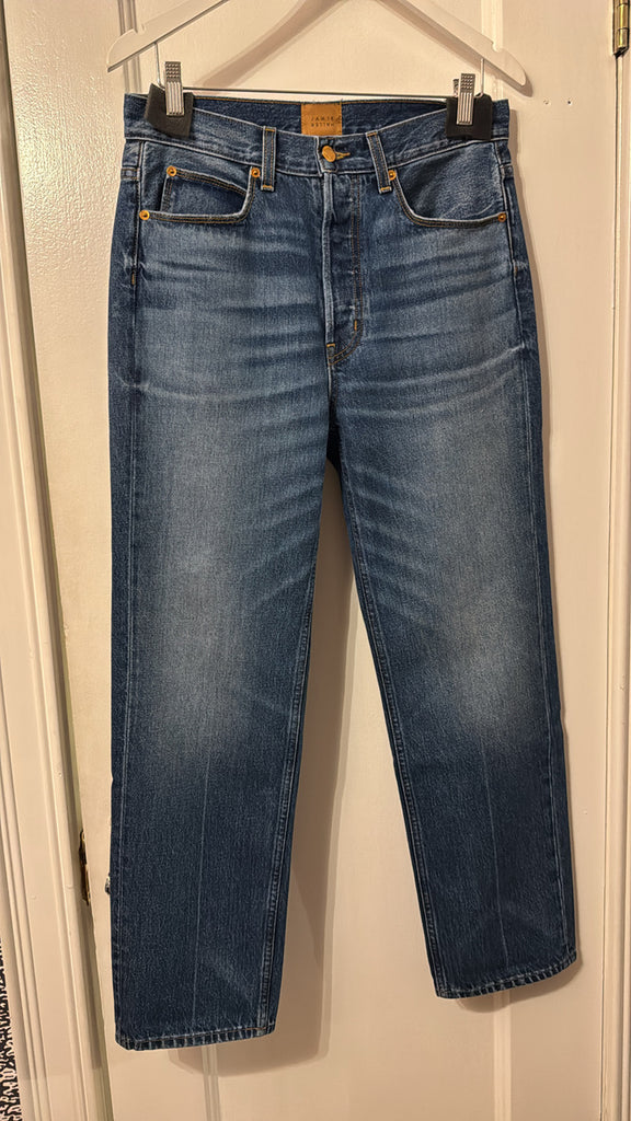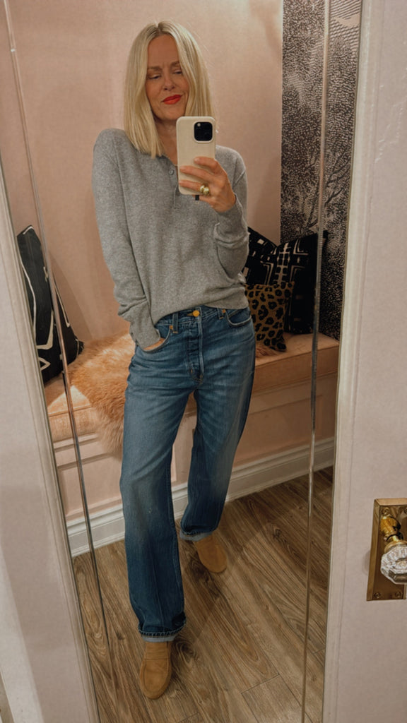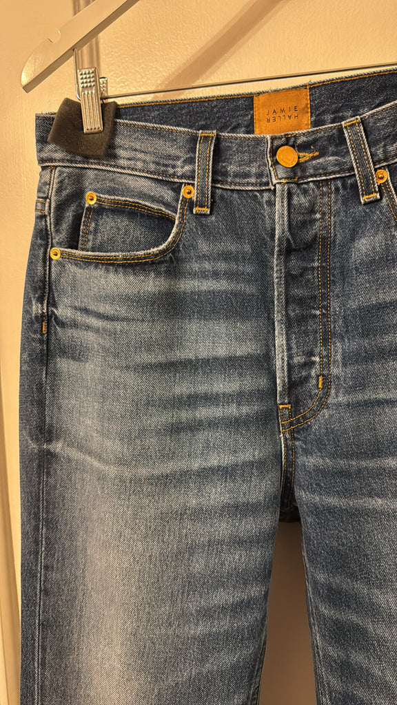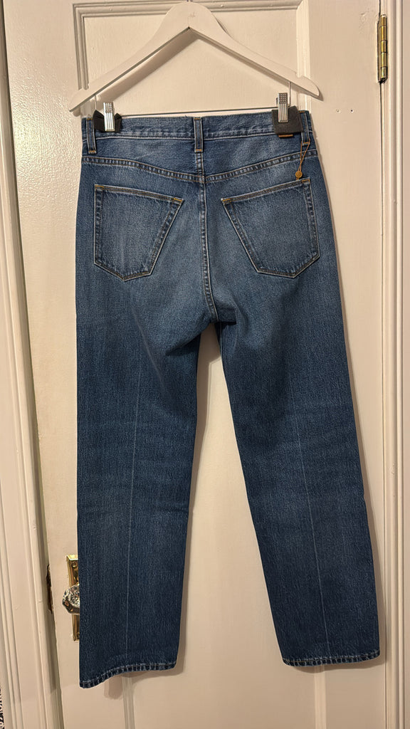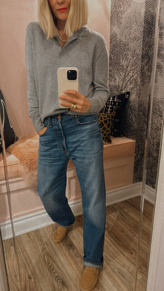A slouched mid rise relaxed ankle fit. A looser fit that perfects a slung slouch and falls from the hip with ease. Jamie prefers them with a knuckle deep single cuff worn back to the loafer. They are the perfect loafer jean. A classic shaped, relaxed jean to show off your loafers.