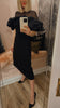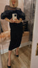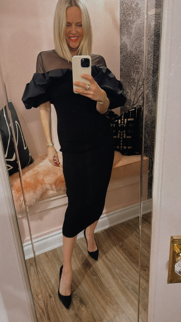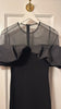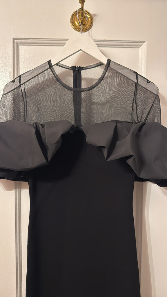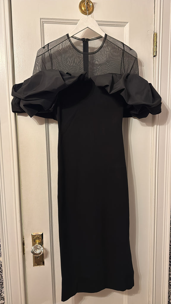 Ribbed dress features a close-fitting silhouette accented by voluminous ruffles that frame the shoulders for a dramatic effect. The sheer tulle yoke and sleeves add an airy lightness, balancing the structured design. Falling to a straight midi hem, it makes a striking choice for evening occasions.