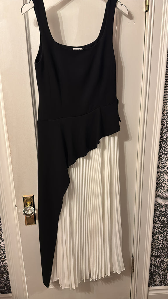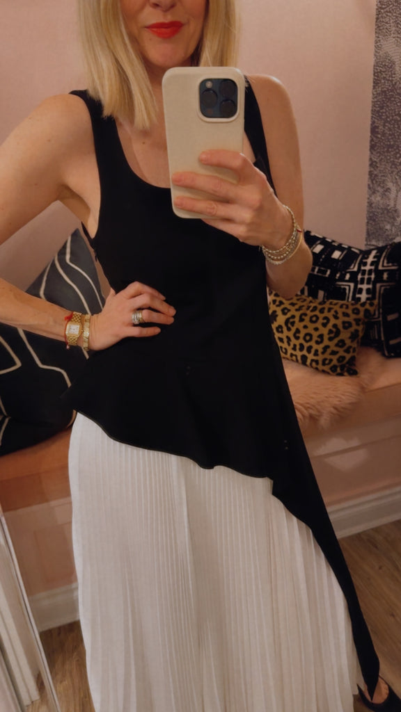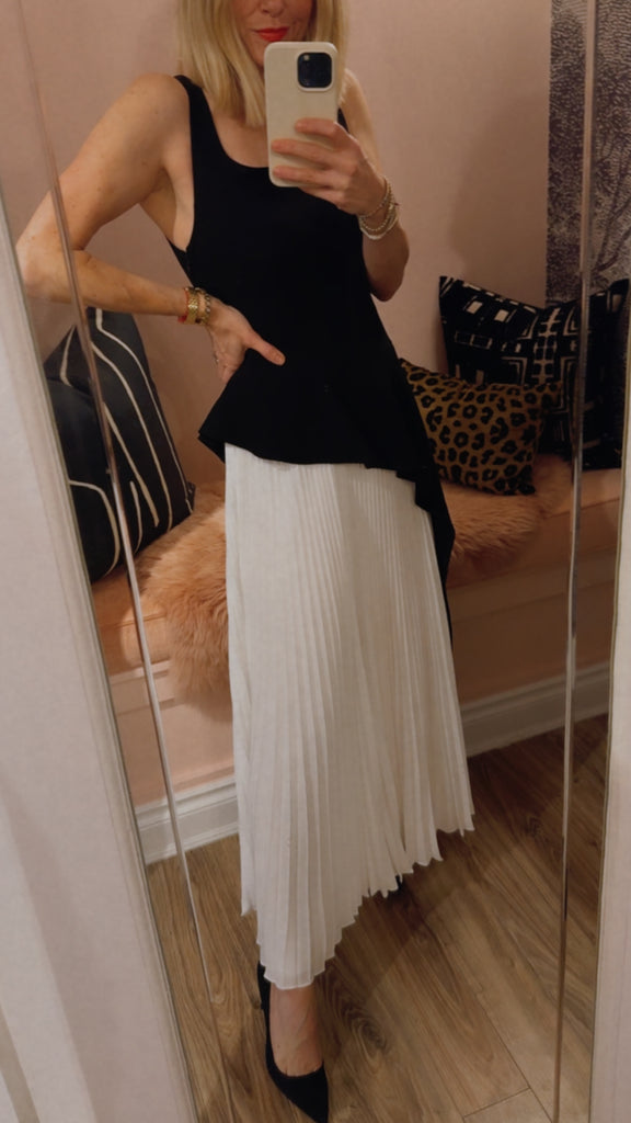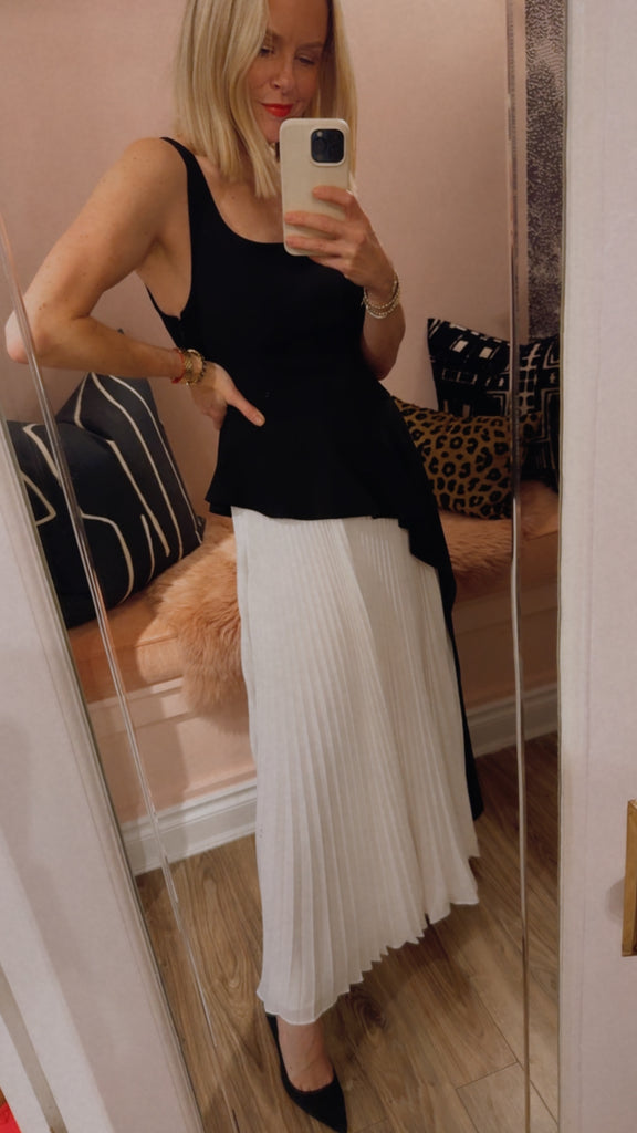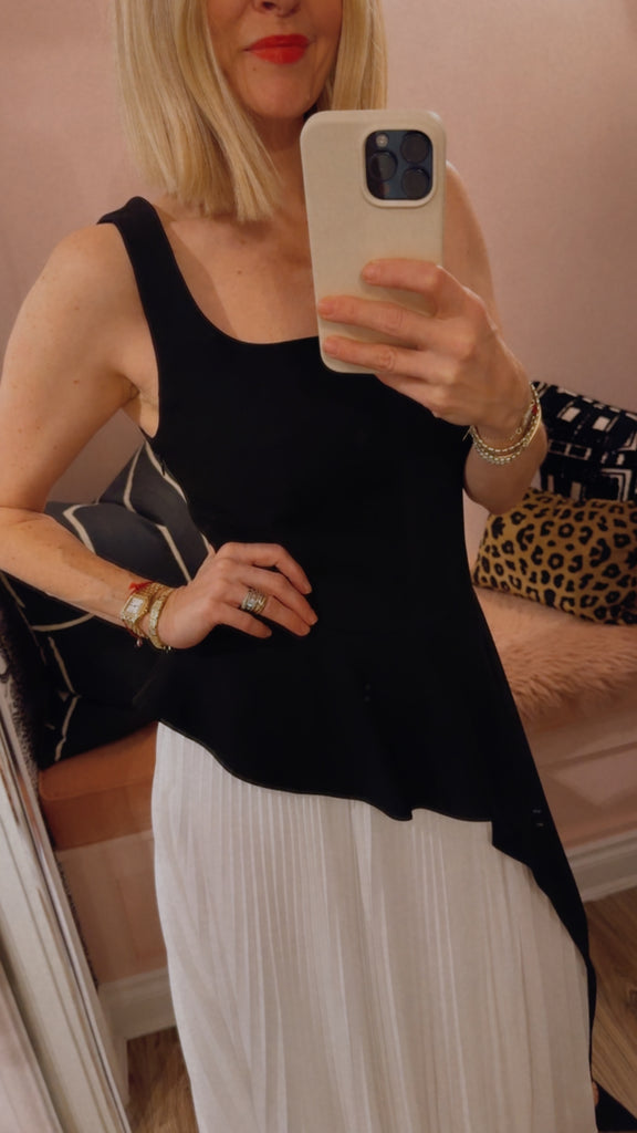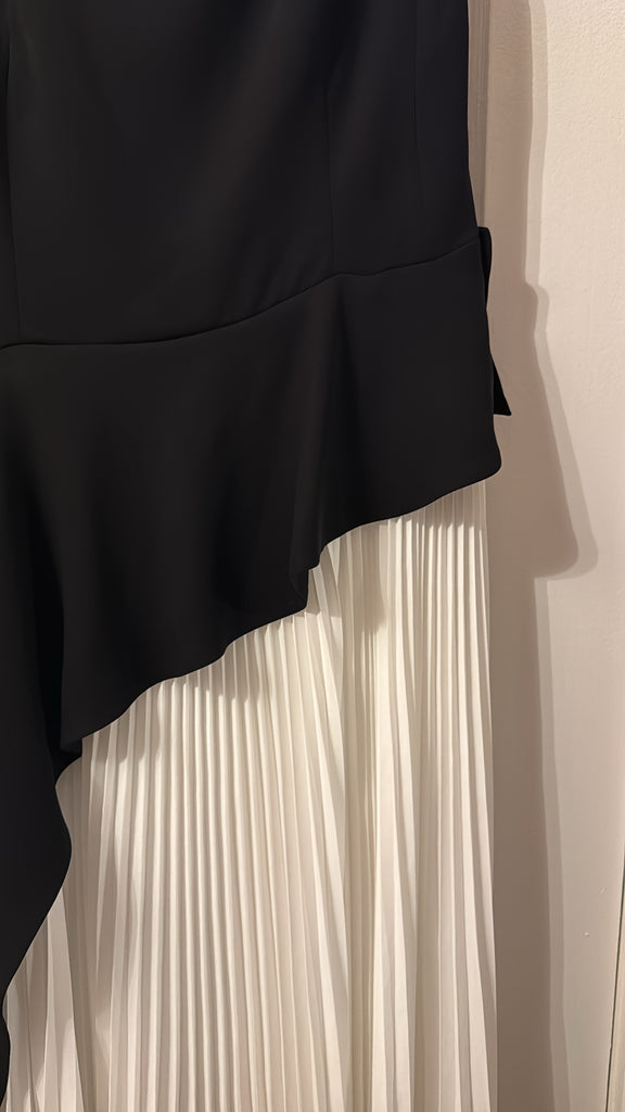Tailored in refined crepe, this maxi dress combines a tailored bodice with an asymmetric peplum layered over a pleated skirt. Contrasting textures balance architectural structure with fluid movement, creating a versatile silhouette finished with meticulous detailing.