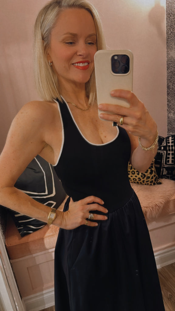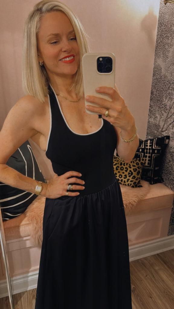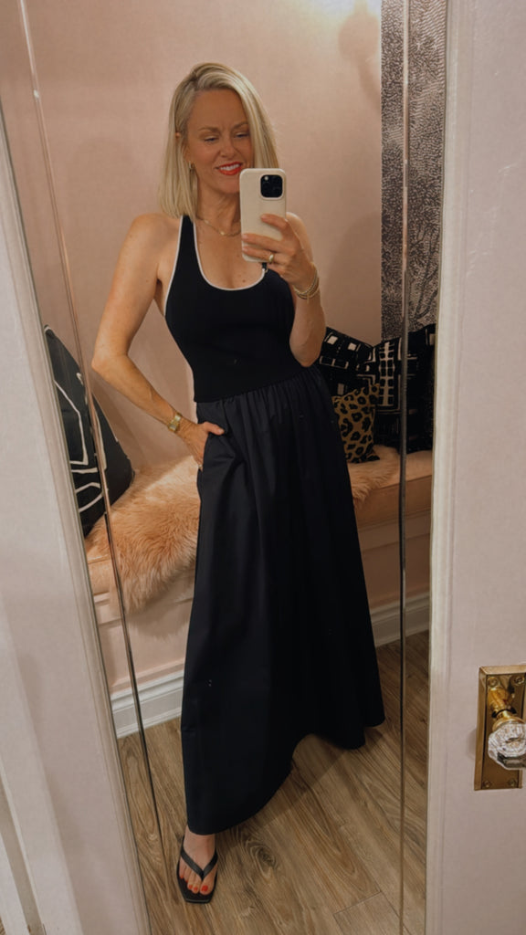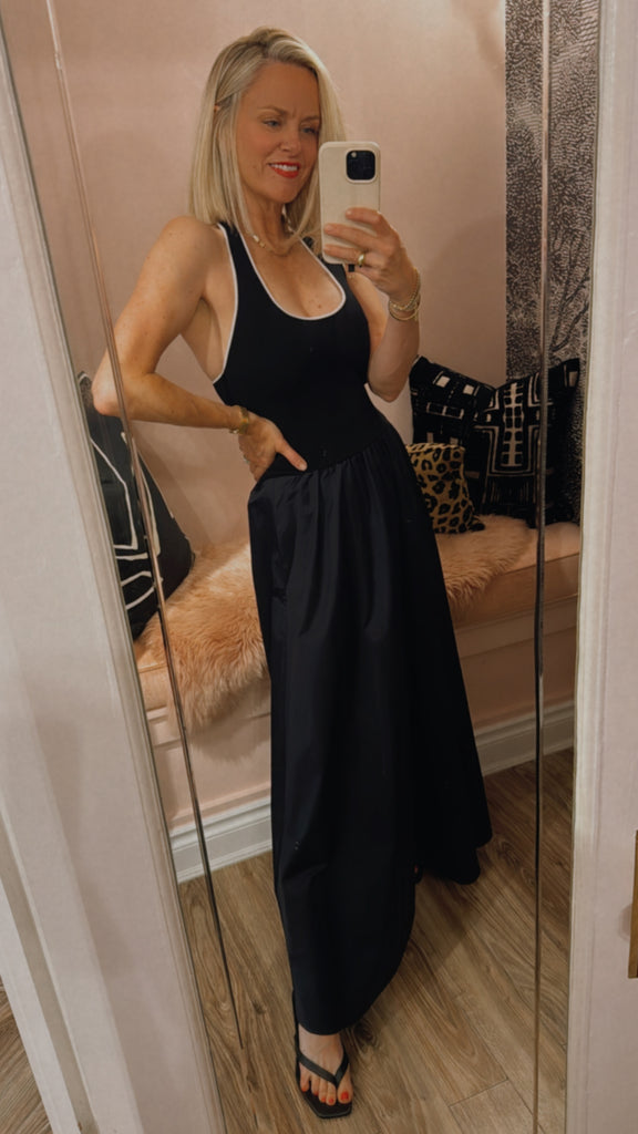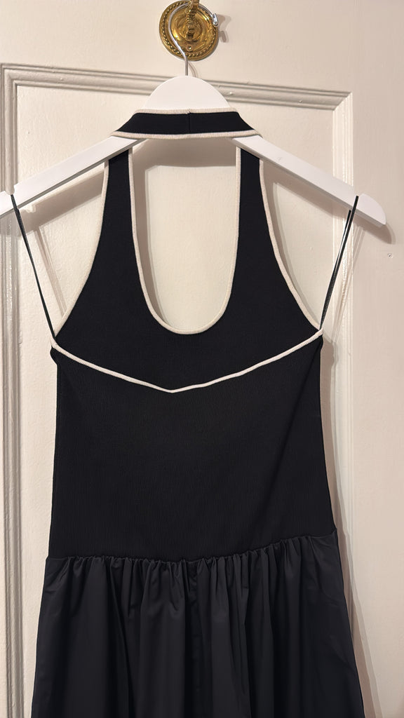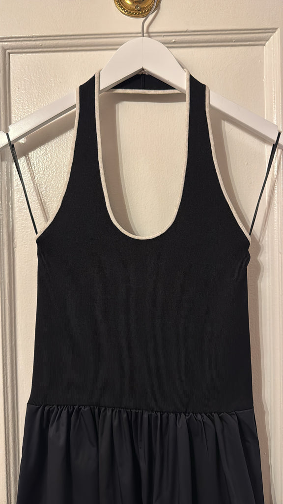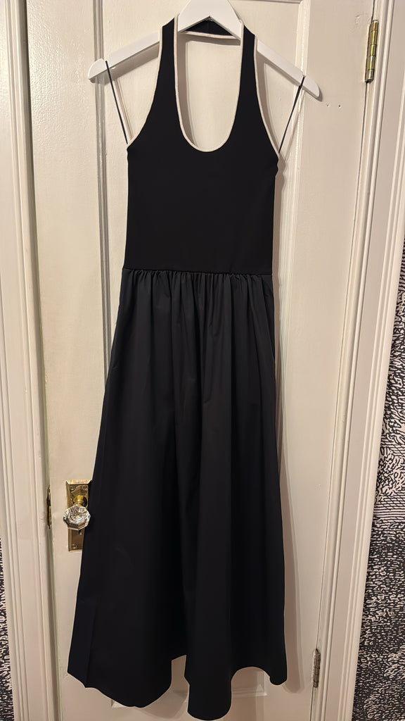 The Halter Gathered Dress offers a fluid silhouette, crafted with a fitted knit upper that flows into a gathered poplin skirt, falling to a maxi length. Featuring a scoop halter neckline, the Halter Gathered Dress is a versatile wardrobe staple that moves seamlessly from day to evening.