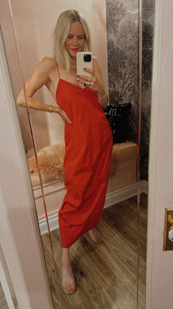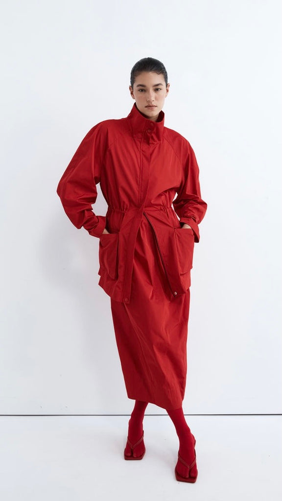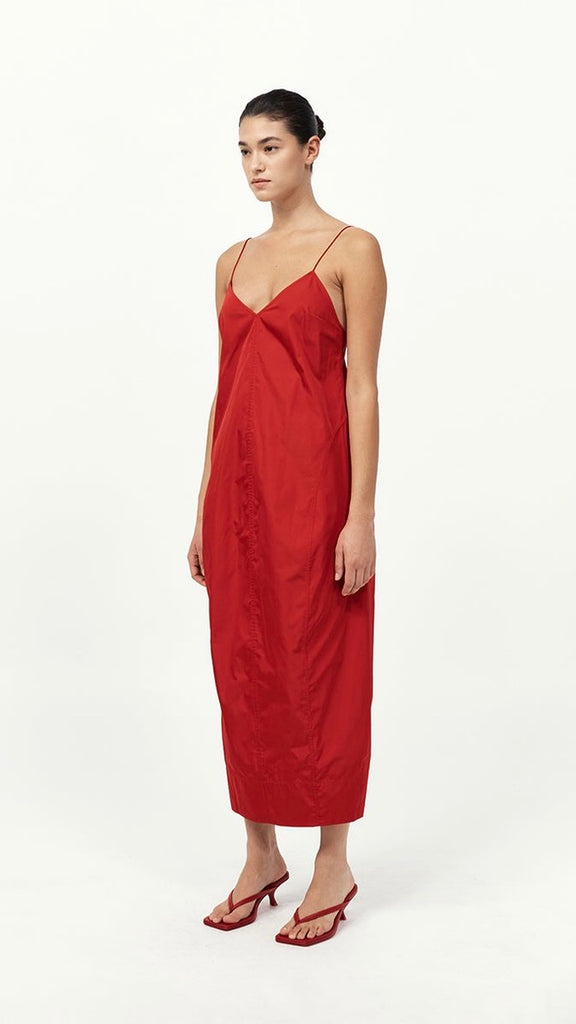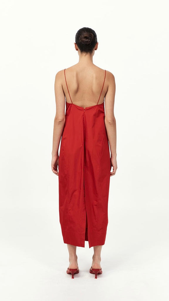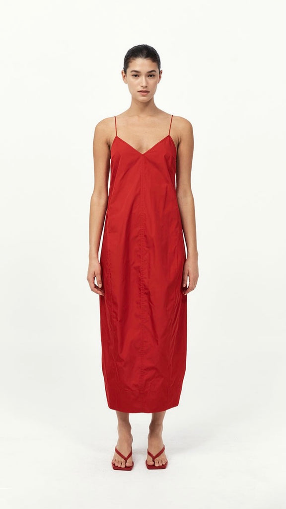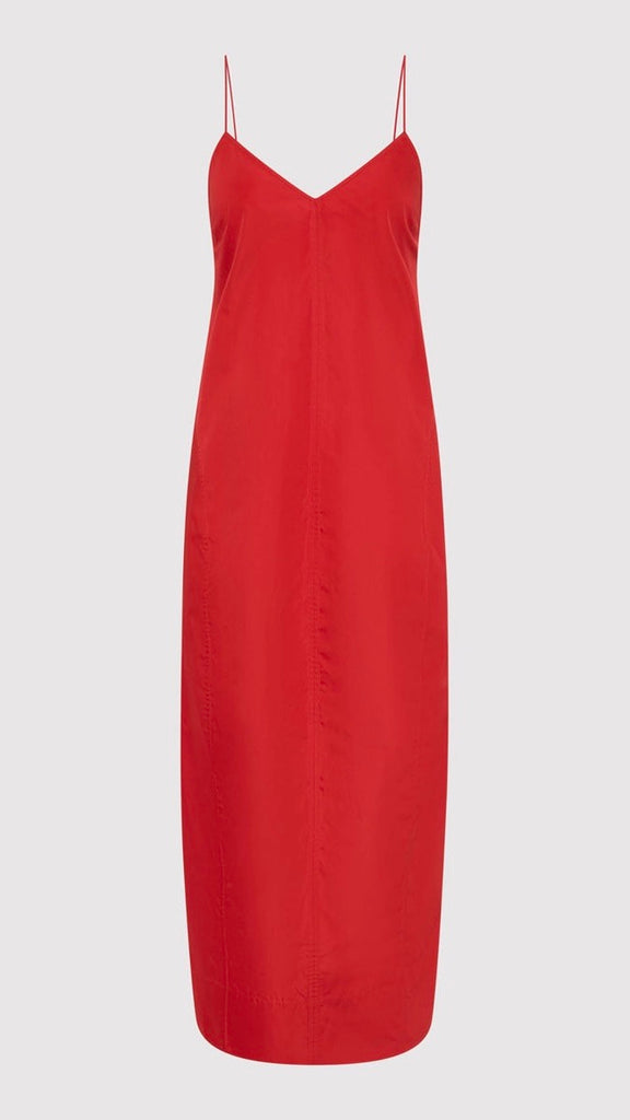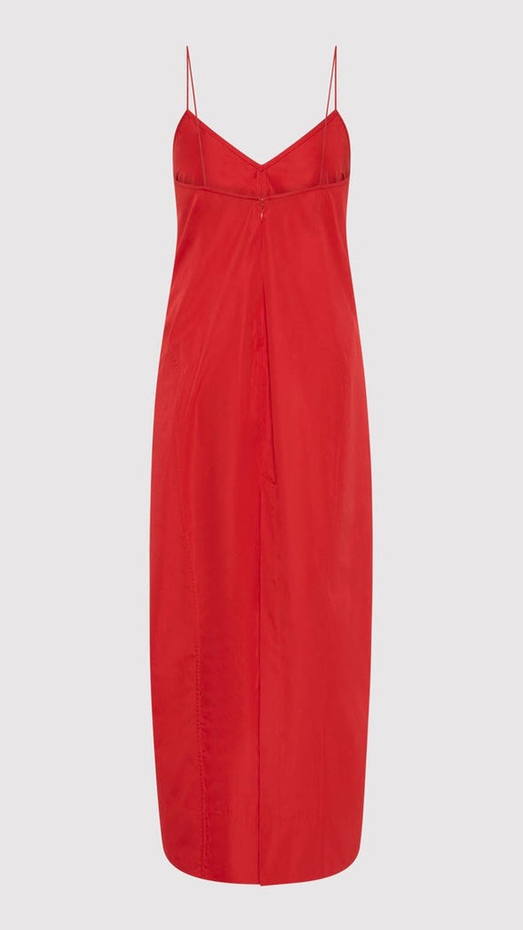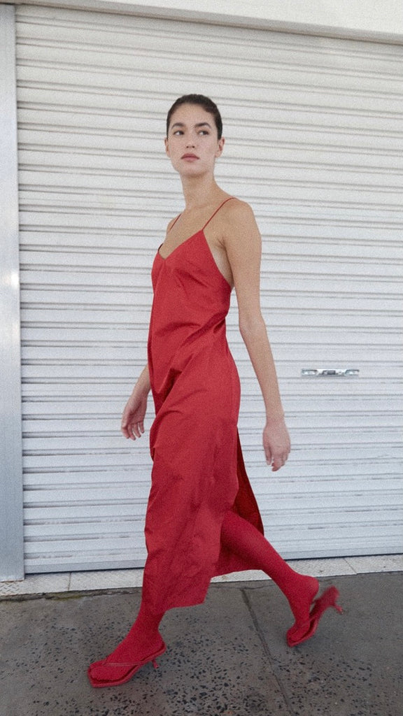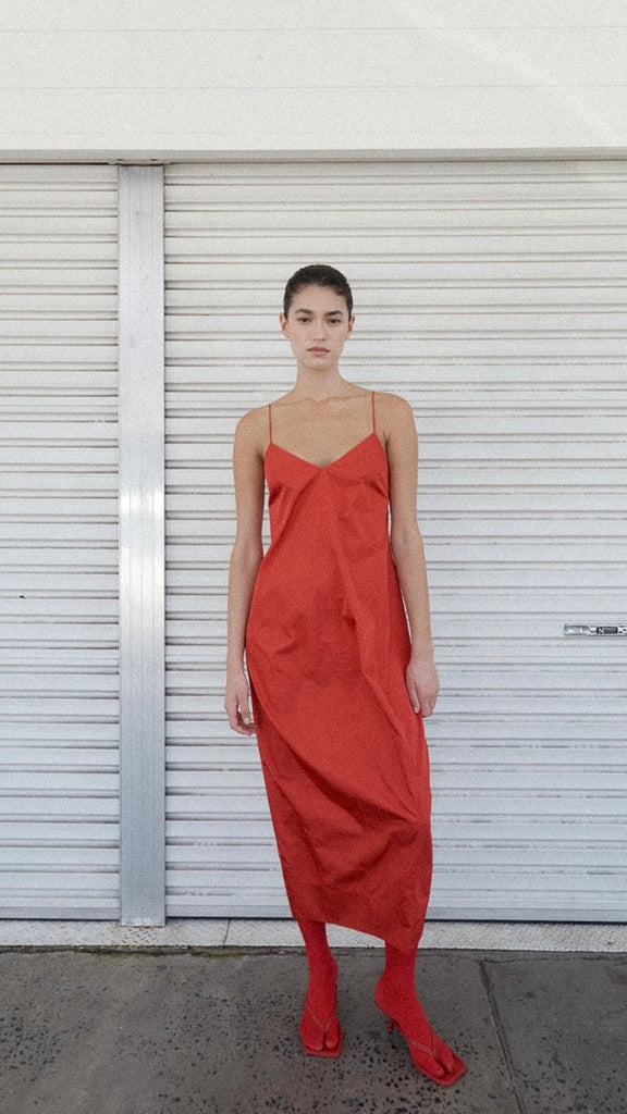 The Paper Taffeta Cocoon Dress delivers an understated yet sculptural profile. Its 7/8 length is balanced by a deep V-neckline, rouleau straps, and curved seam detailing. The Paper Taffeta Cocoon Dress offers a fluid silhouette that feels refined and contemporary.
