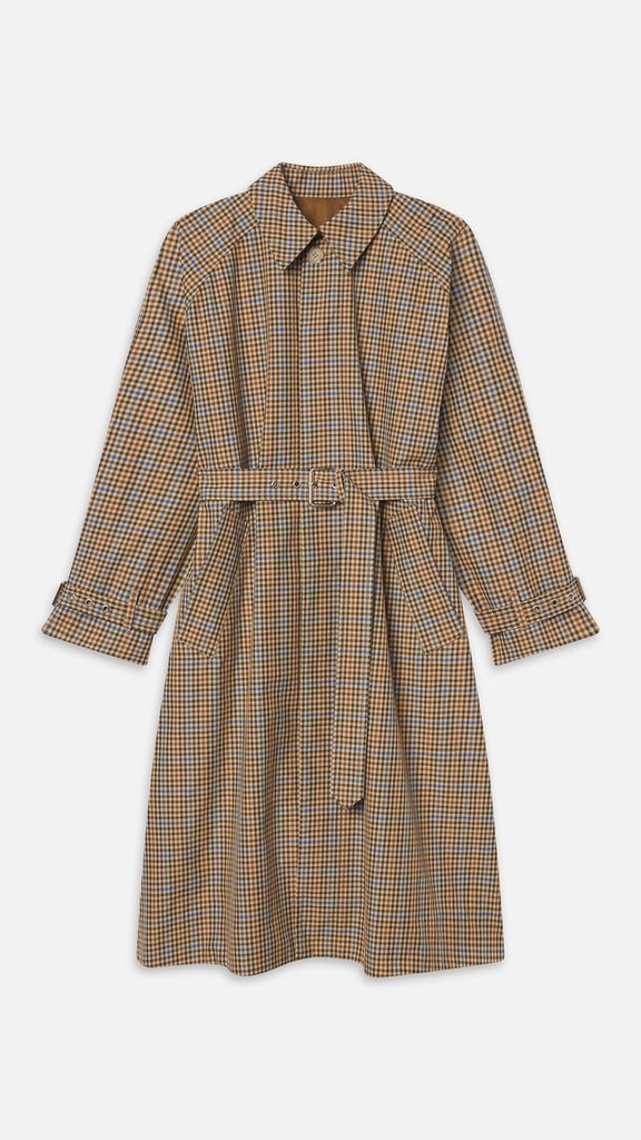 The Plaid Mac Coat is crafted from a structured cotton blend with a fully lined interior, featuring a clean covered button front and adjustable buckles at the cuffs and waist for a polished, tailored finish. Finished with a water repellent coating.