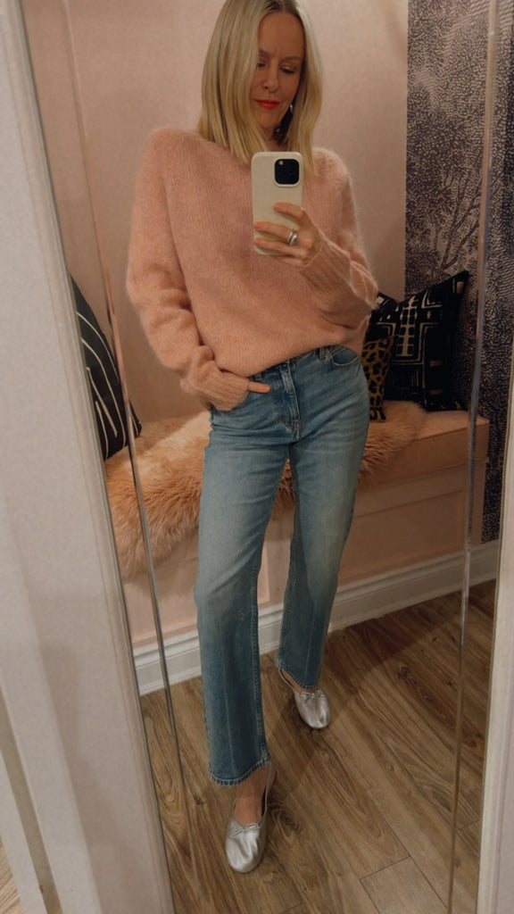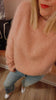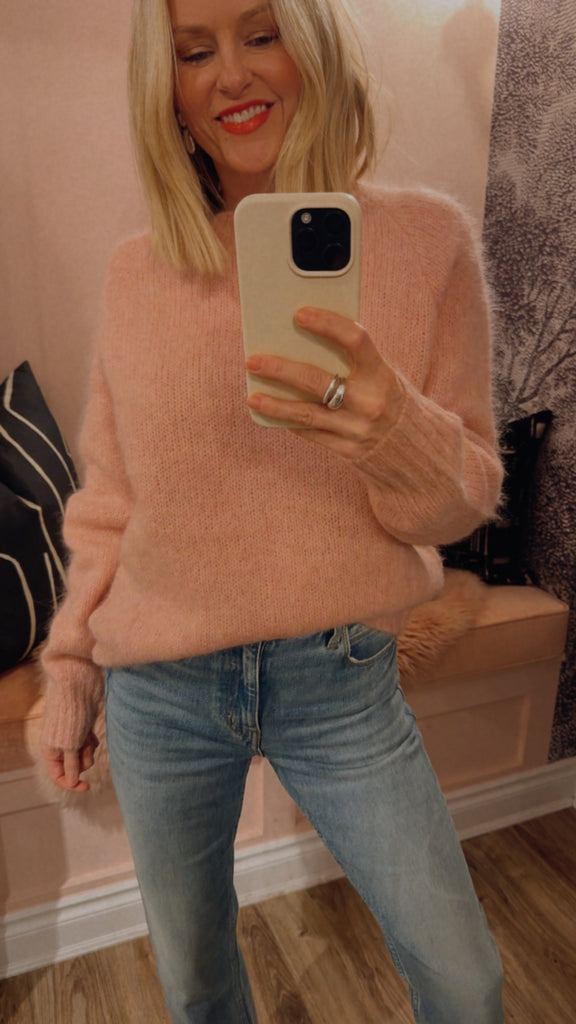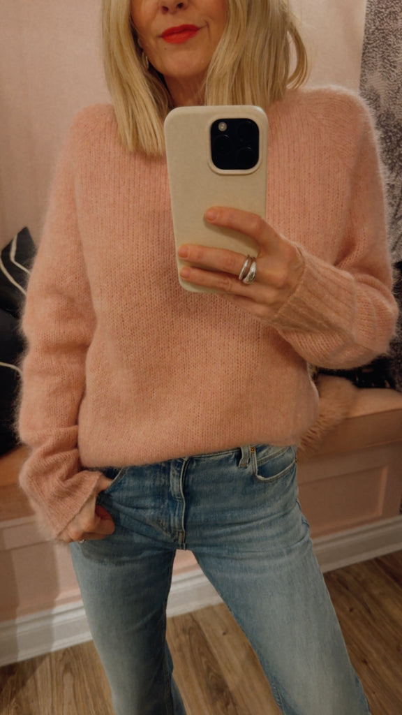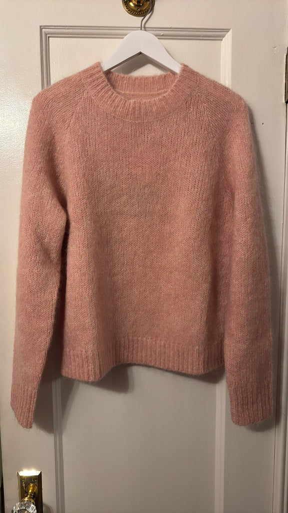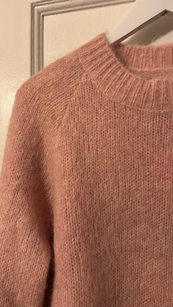 A classic crew with a slight raglan shape at the shoulder. A chunky knit neckline. Knitted in a soft and hairy yarn in a lightweight, chunky stitch.