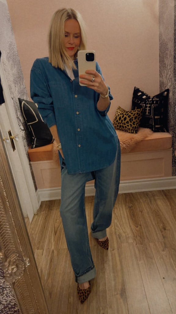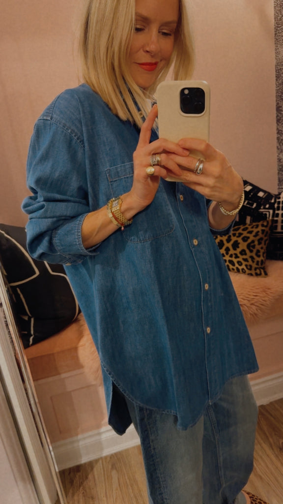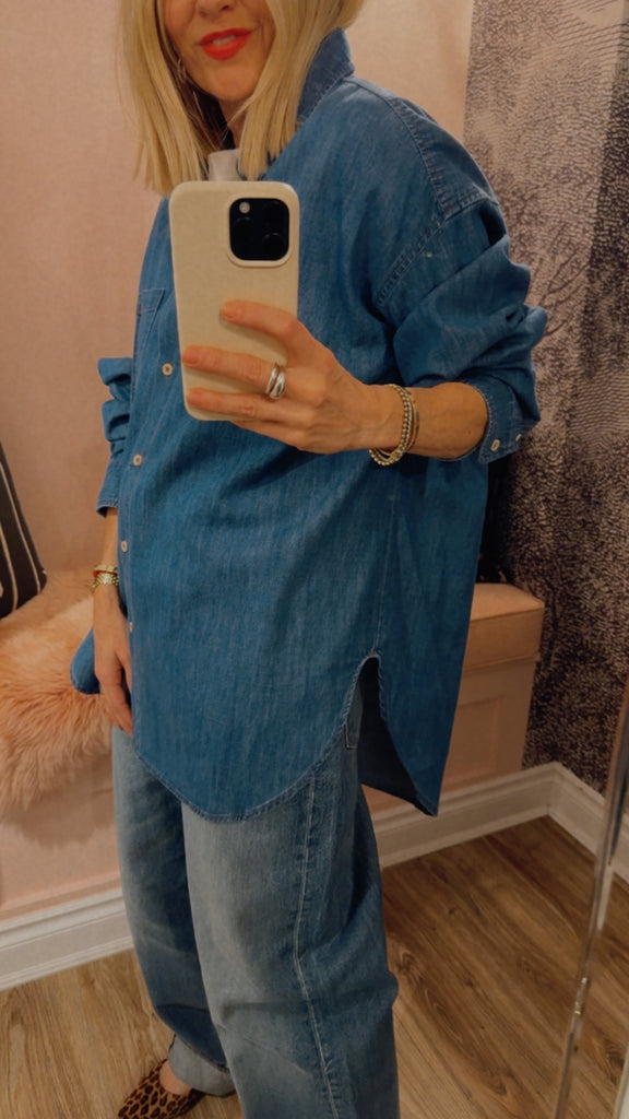 Expertly cut for a beautiful denim drape with a straight, relaxed shape. A perfectly placed button at the chest allows for a deep neckline. A button under the neckline creates the opportunity for a high buttoned up look without the choke. A small button perfectly placed on the hidden cuff placket for an easy undone cuff that doesn’t get away from you. Small details make the difference and create an undone feeling that can still feel polished. Design that supports styling.