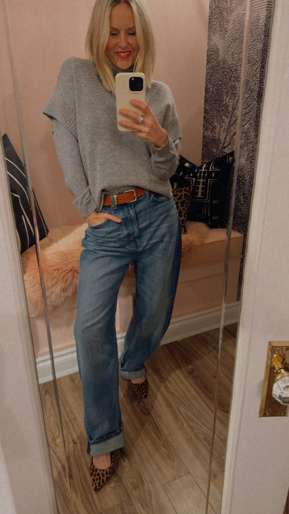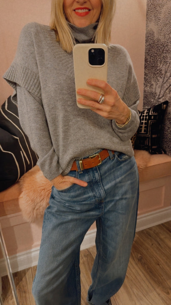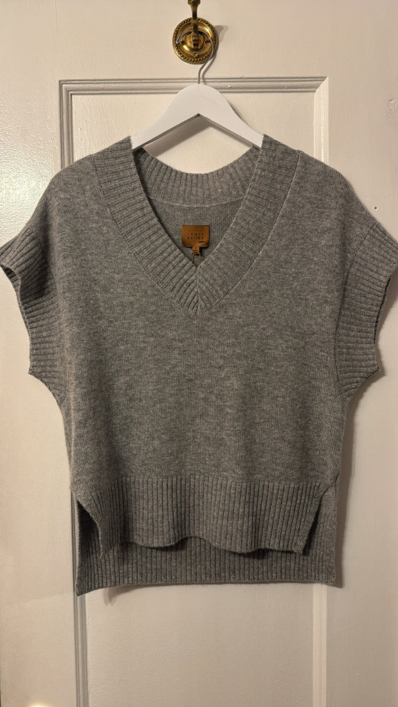 A boxy V neck sweater vest that can be worn on it's own or paired back to coordinating cashmere basics for that layered look with a 70's feel.
