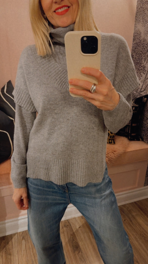 70% Wool 30% Cashmere, in Heather Grey.