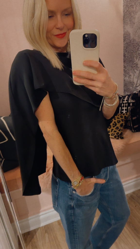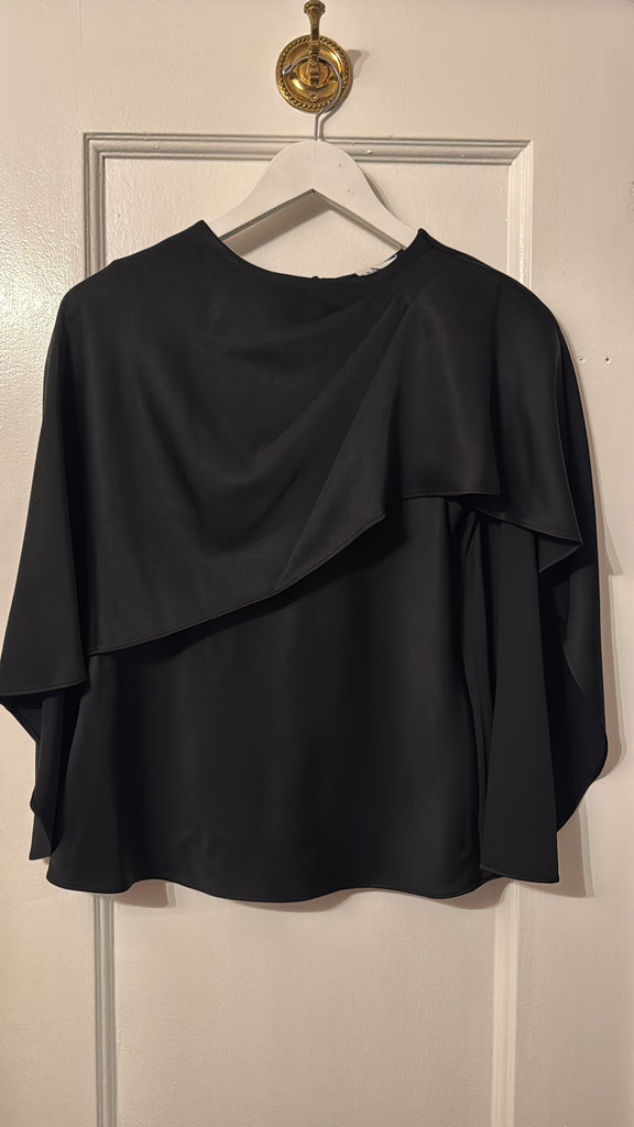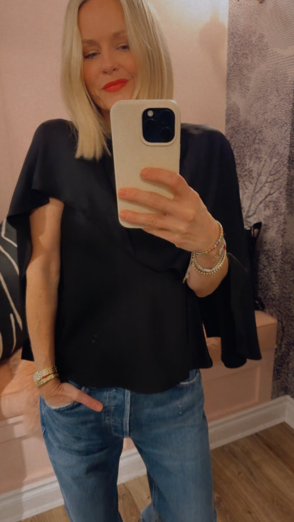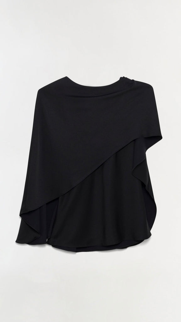 Cut from fluid satin, this top is designed with an asymmetric draped overlay that falls softly across the shoulder. The clean neckline and minimal structure balance its sculptural ease. A refined expression of modern drape.