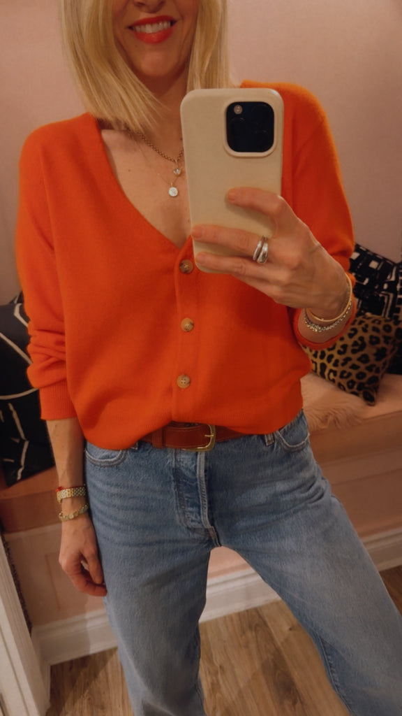 The Cashmere Tiny V-Neck Cardigan is inspired by vintage menswear cardigans, reimagined in smaller proportions. The silhouette is boxy with a cropped body length and sleeves designed to hit just above the wrist. It features a classic V-neckline with a clean finished edge, horn buttons, and delicate ribbing at the cuffs and hem. Knit from lightweight, soft cashmere with a cozy hand.