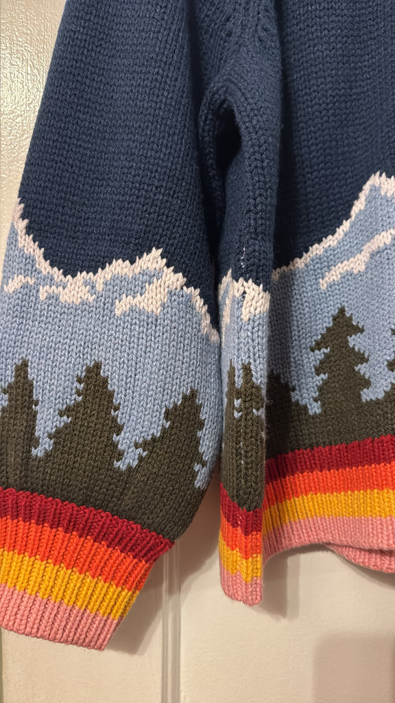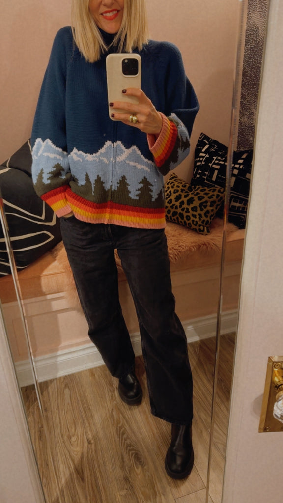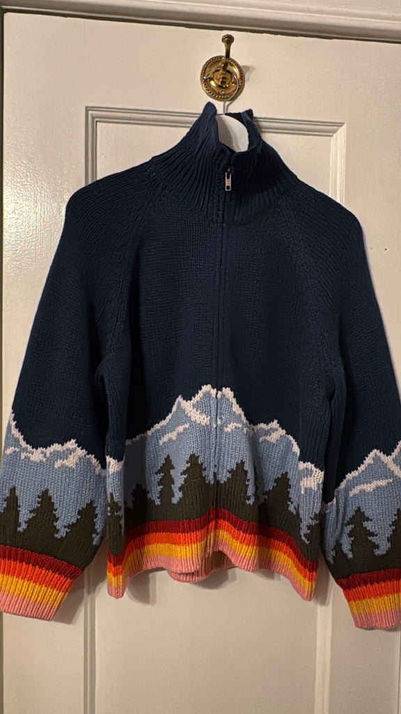 Super soft full zip sweater from the Great Outdoors with an colourful knit-in mountain scape and high neck.