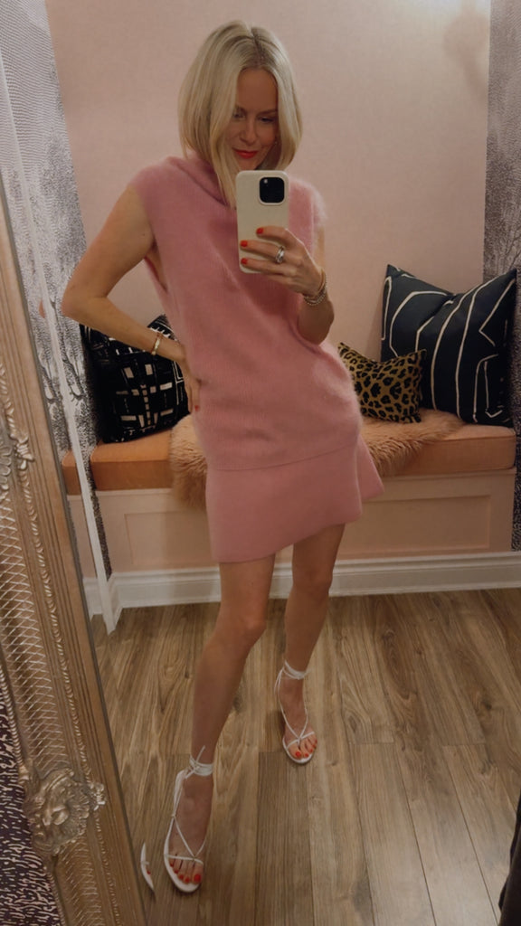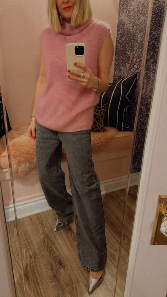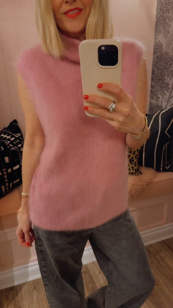 The Aisla vest is a light weight sleeveless knit top, long through the body with a high neck and made in a soft brushed cashmere.