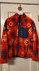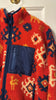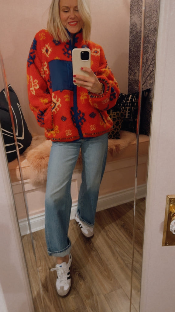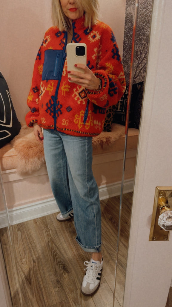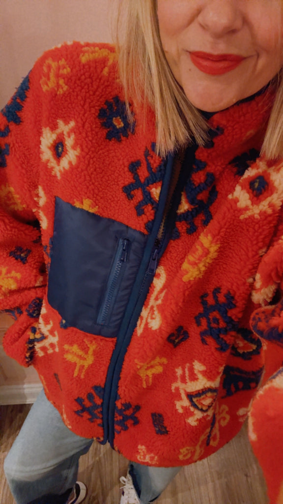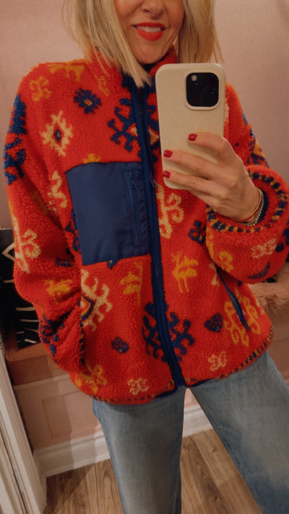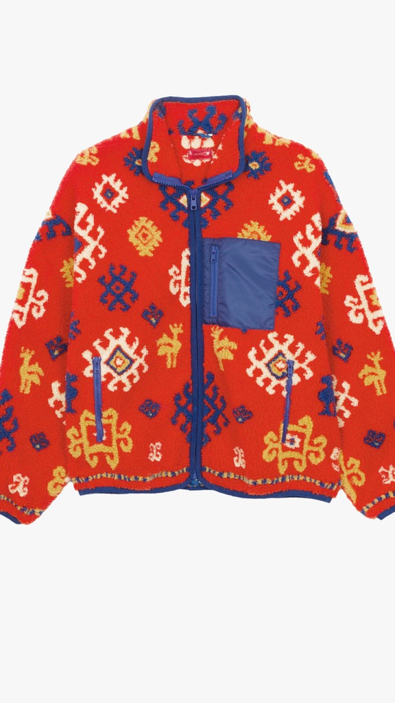 It's showtime. A cozy fleece jacket with a high neck, drop shoulders, zip pockets and curved hems. Designed in red, Sing For Your Supper features a folk art-inspired graphic print with blue trim and details.