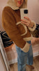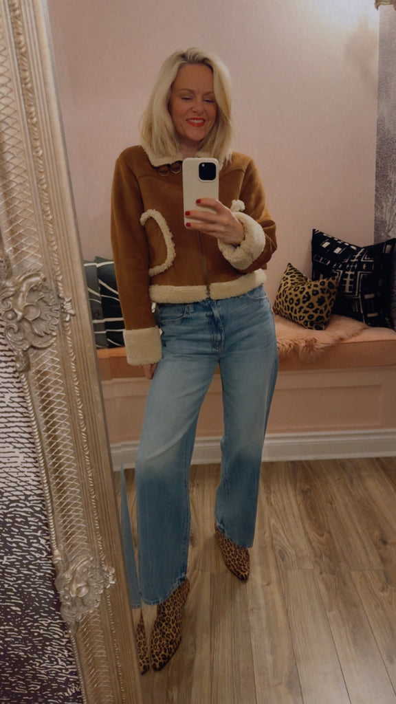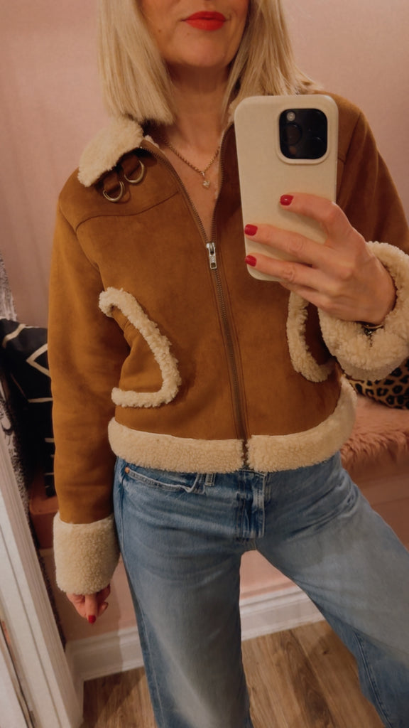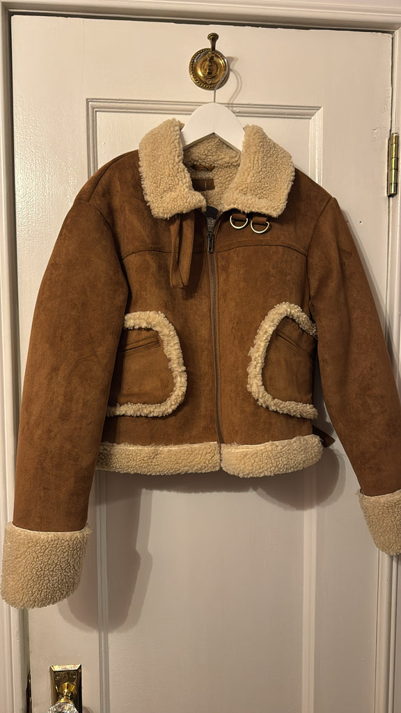 Choose your own adventure. A cropped jacket with front patch pockets, buckle details on the collar and sides and a boxy fit. Designed in caramel faux-suede, Story Untold features off-white faux-shearling lining at the pockets, collar and hems.