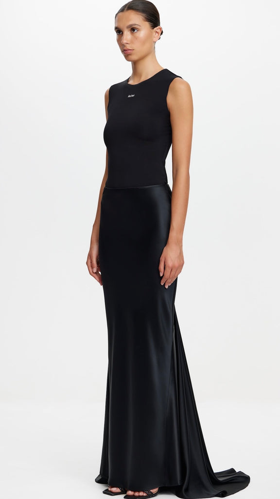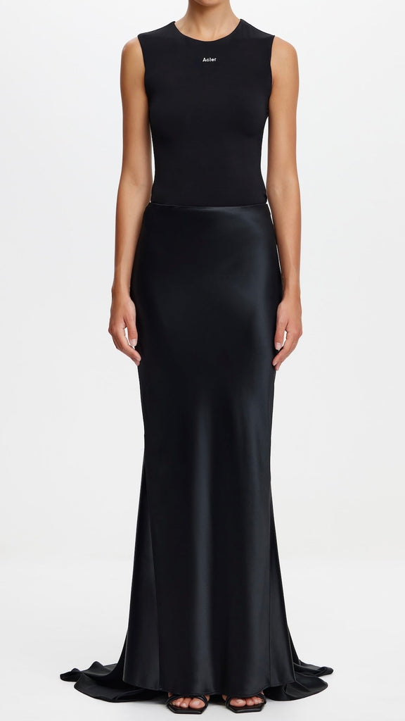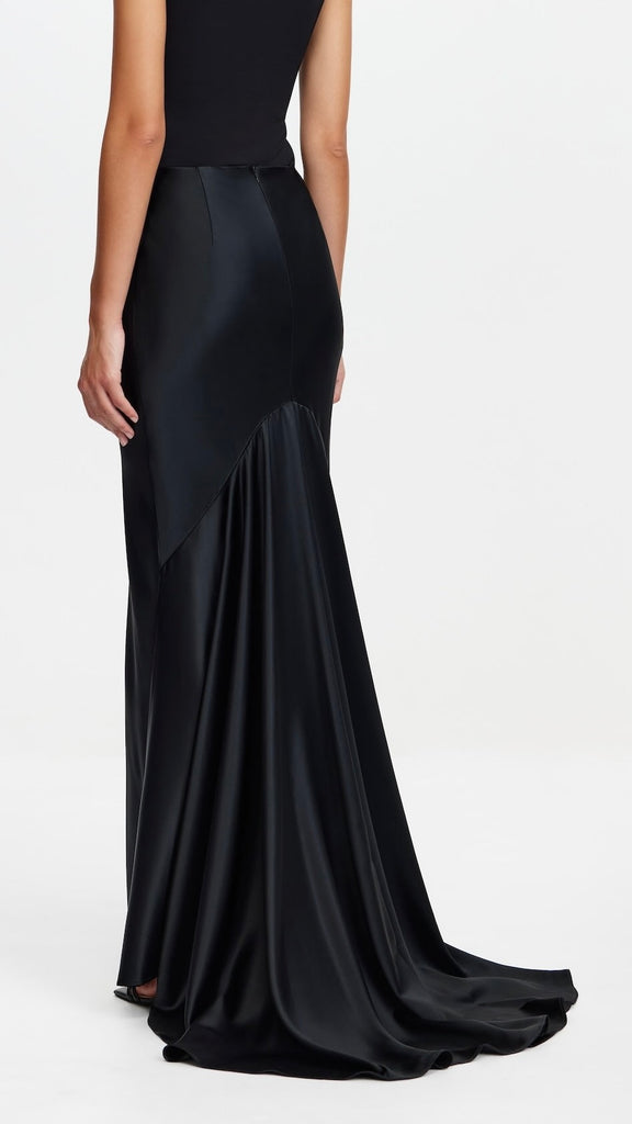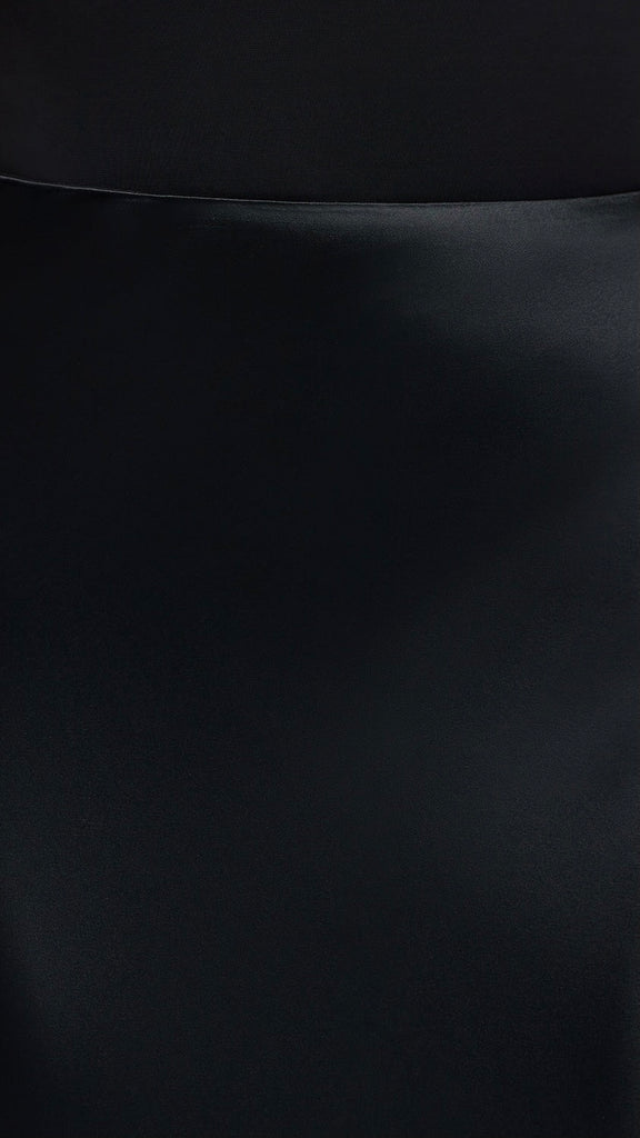 Designed for timeless elegance, the Hourston Maxi Skirt in Black offers sophistication with its fluid silhouette. Cut on the bias from lustrous satin, this high-waisted design skims the body, falling into a graceful back train. Fully lined for a smooth fit, the skirt is secured with an invisible centre-back zipper, making it perfect for elevated styling.