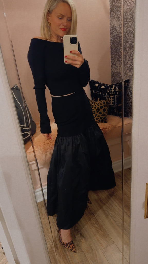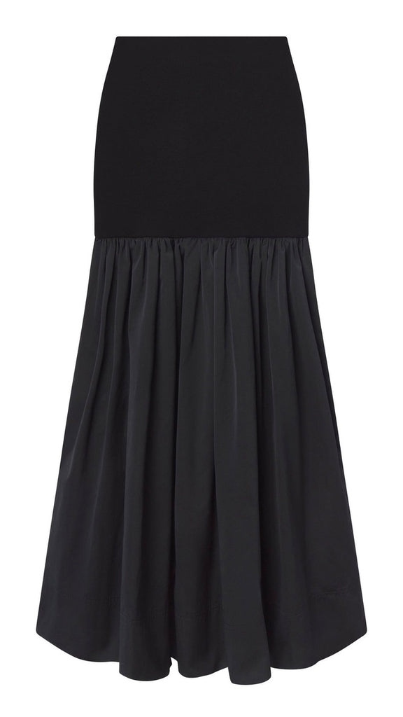 The Cami Skirt is a modern ballroom-inspired maxi designed to elevate your evenings. Crafted from 100% stretch merino wool, the fitted high-rise mini panel contrasts sharply with the gathered skirt, creating a bold, sculptural silhouette. Lightweight yet structured, it holds shape and adds instant drama to any look.
