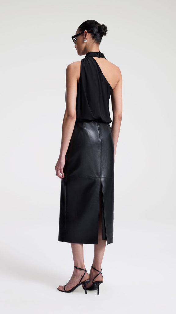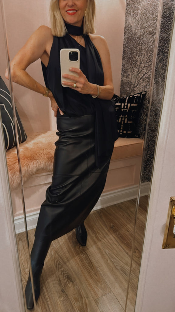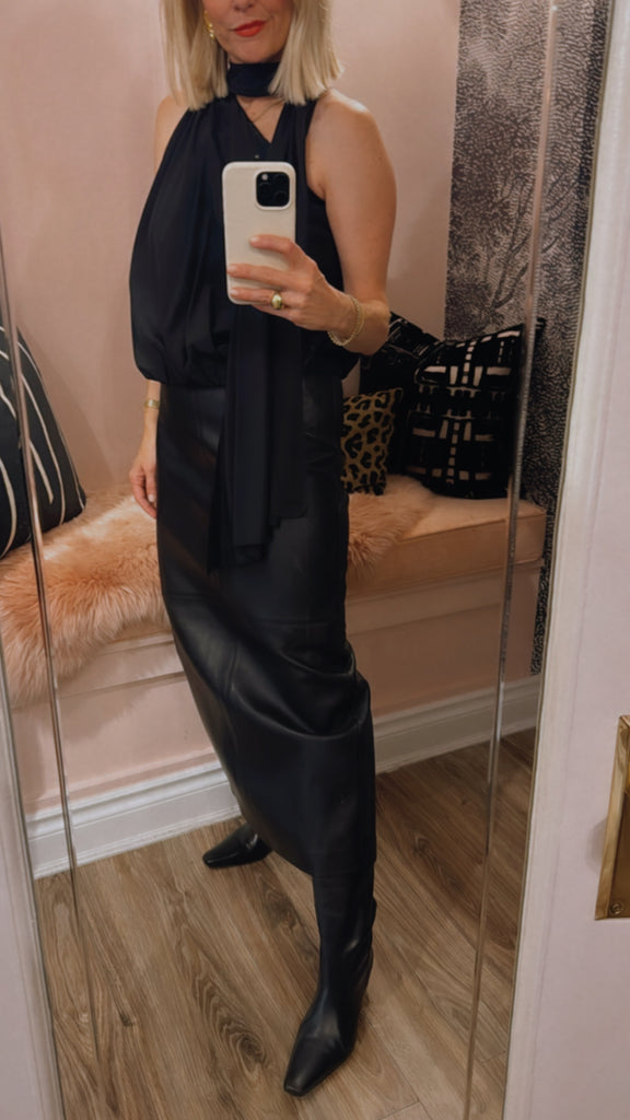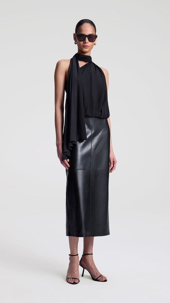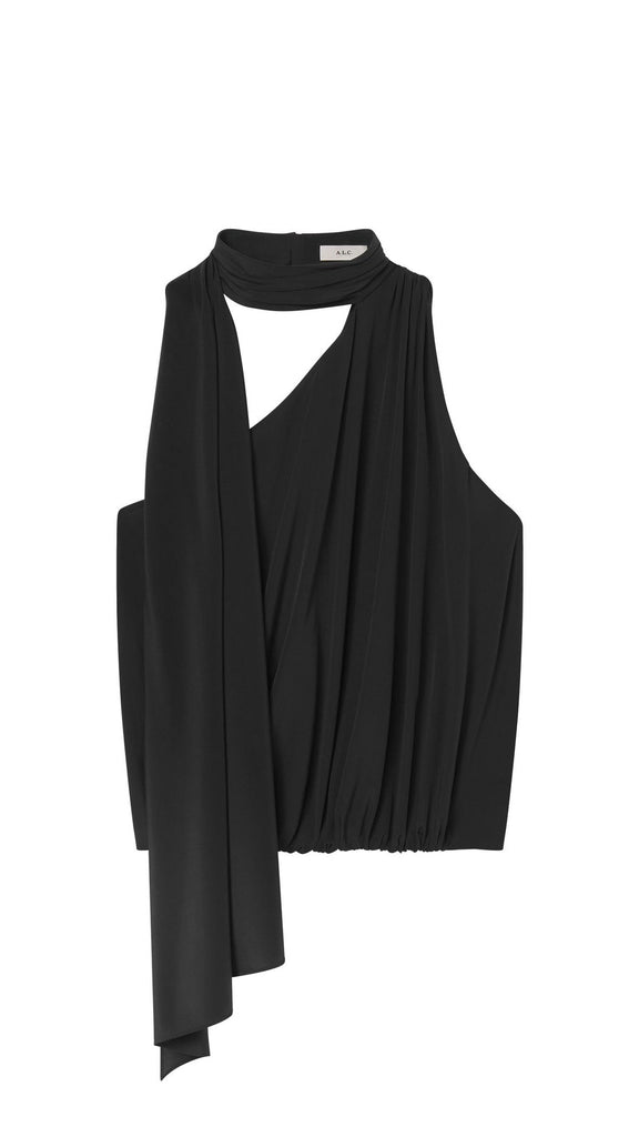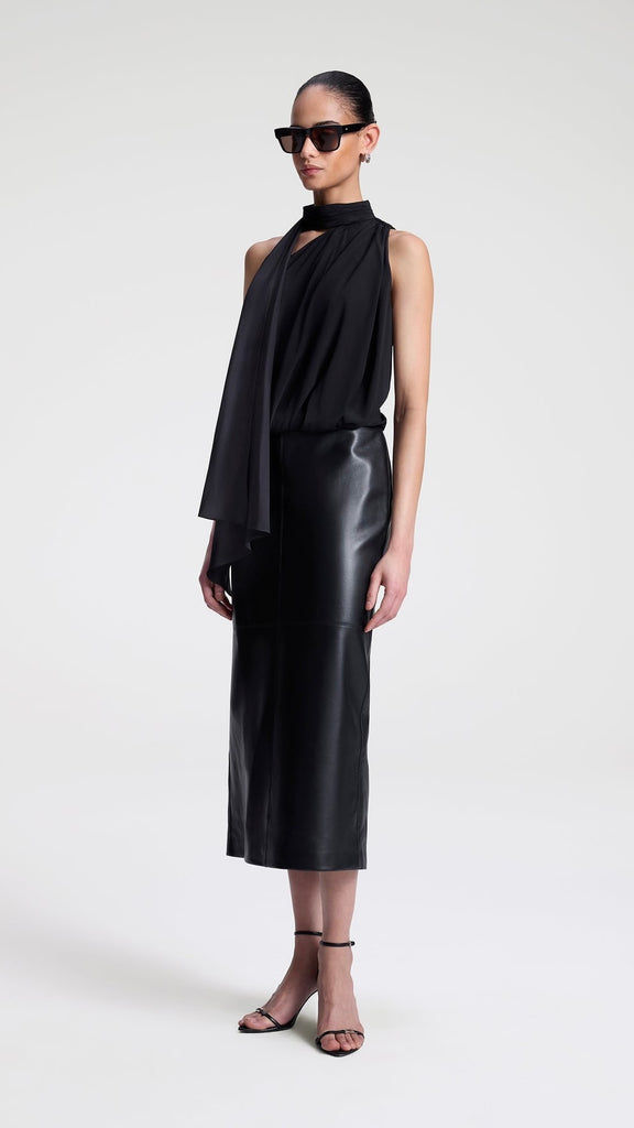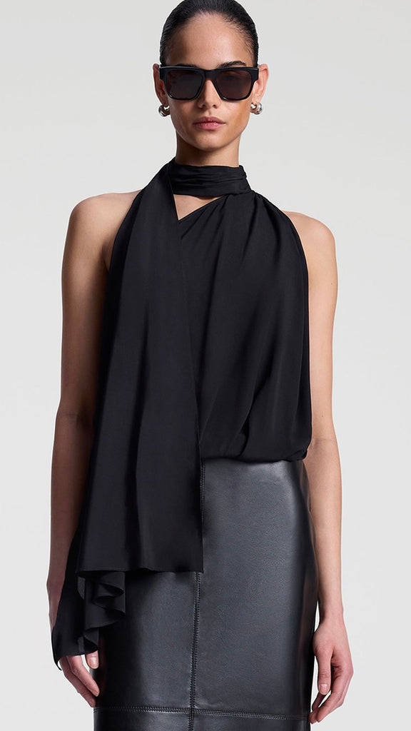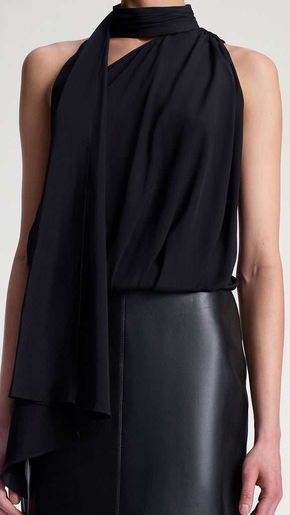 Fluid stretch silk and a sculptural draped neck scarf define this sleeveless silhouette. Featuring a subtle bubble hem, this style sits effortlessly over high-waisted skirts or tailored trousers.