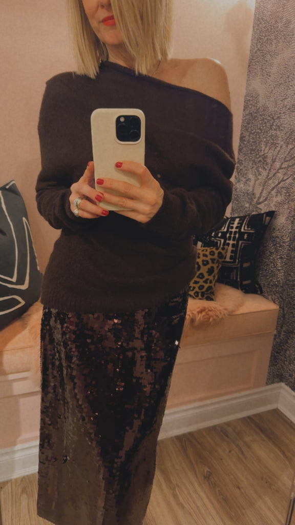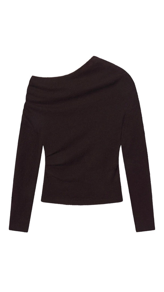 The Freya Top is a modern, sculptural take on the off-the-shoulder sweater. Crafted in a soft alpaca and Merino wool blend in a deep plum hue, this lightweight brushed knit feels cozy yet refined. The asymmetric off-the-shoulder silhouette and long sleeves create subtle drama, while the drapey finish allows for effortless styling—perfect layered under a blazer, paired with tailored trousers, or worn with skirts for evening occasions.