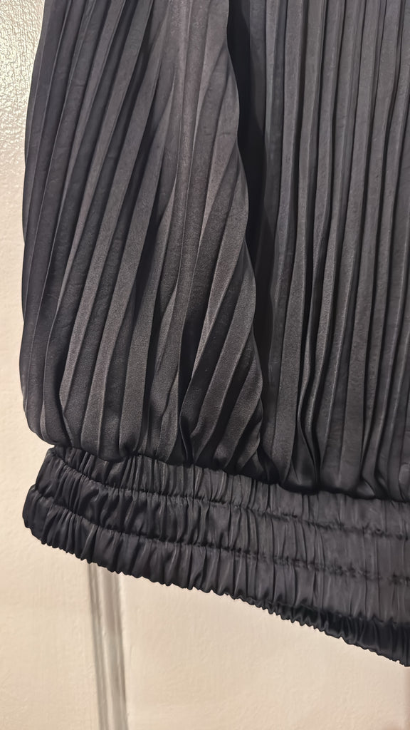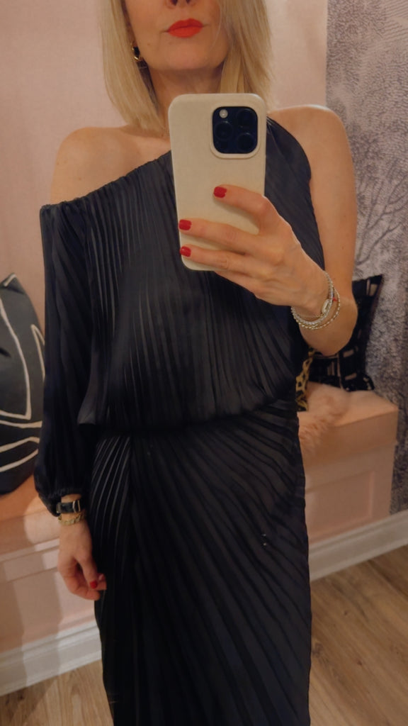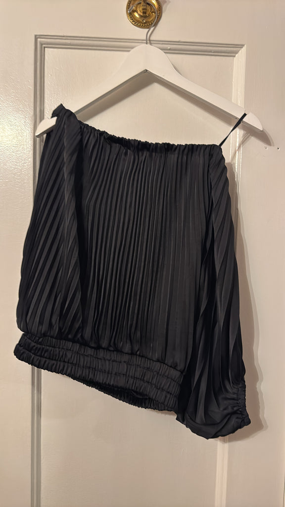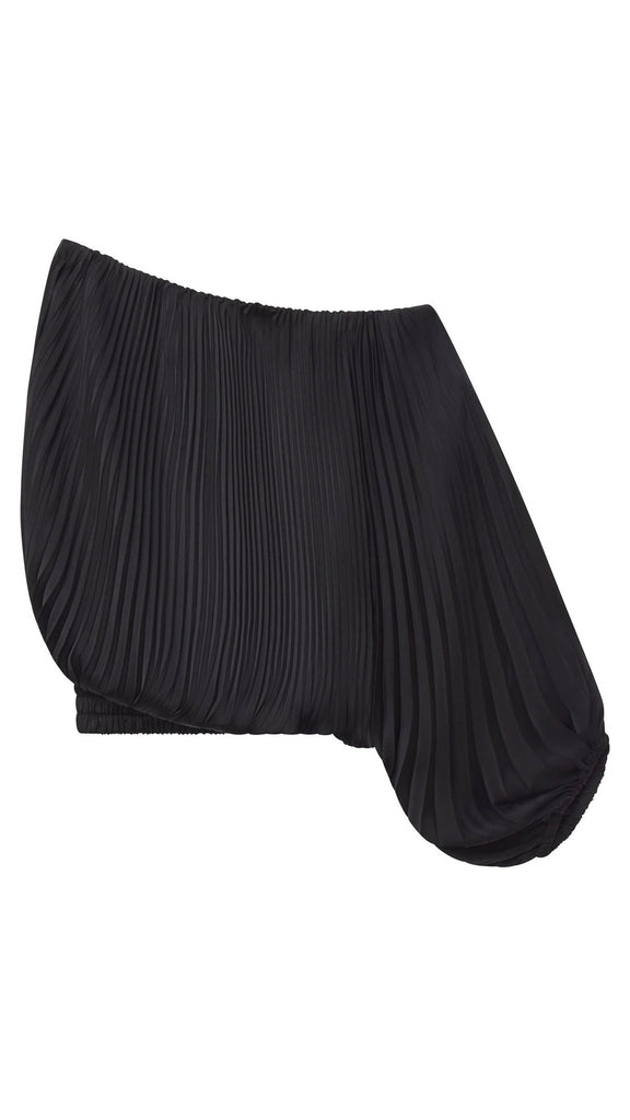 The Mara Top embodies sculptural ease through fluid pleating and asymmetric form. Crafted from vintage satin in black, this one-shoulder silhouette drapes beautifully across the body with an elasticized hem for shape and movement. The billowed sleeve and glossy finish evoke understated glamour—ideal for evening events or holiday dressing.