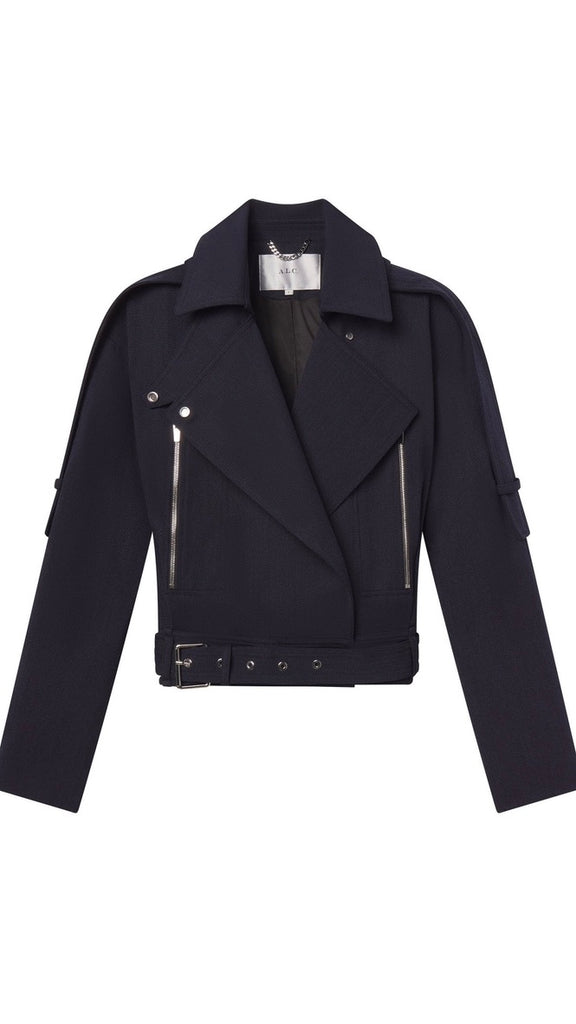 The Marvin Jacket updates the classic moto with a sharp, structured sensibility. Crafted from wool-melange twill, it features exaggerated lapels, clean zip detailing, and a wide grommeted belt that defines the cropped silhouette. Epaulettes and a storm-shield back introduce subtle utility, while the overlapping snap cuffs add a distinctive finish.