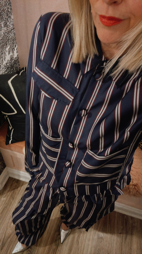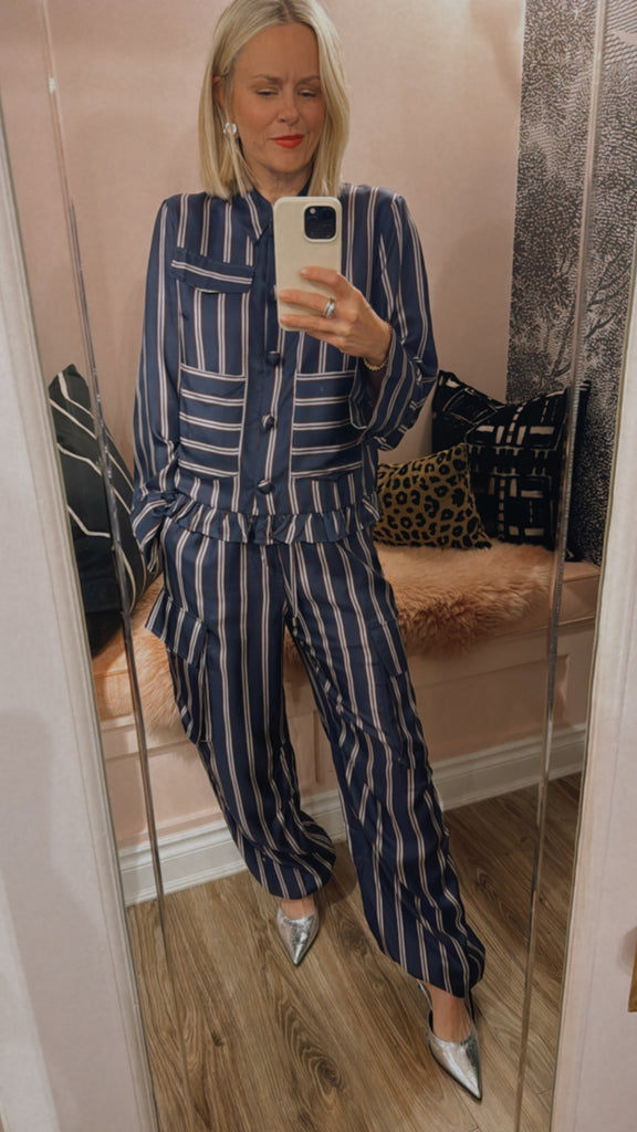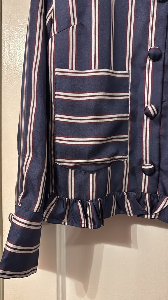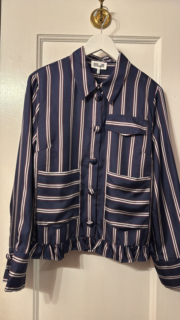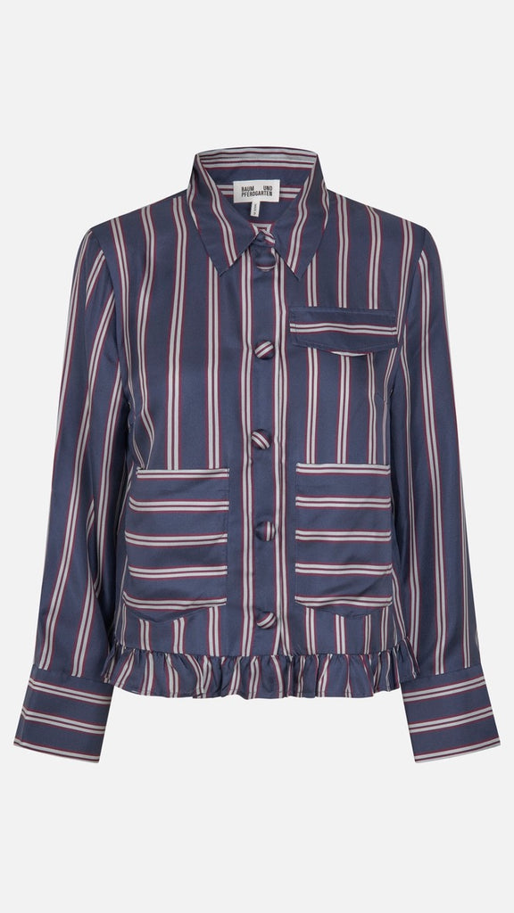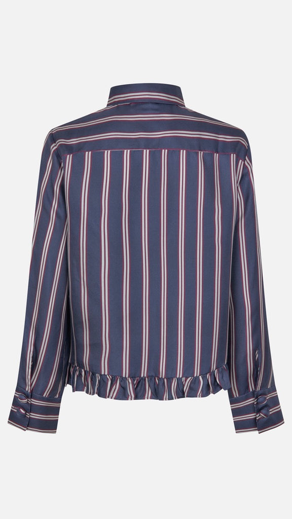 The Miluna Blouse is a silk dream with striped elegance. The classic blouse is made in the softest silk twill that feels light and luxurious on the skin. The silk blouse has a relaxed fit with collar, cuffs and a pretty ruffle at the hemline. Style it with some trousers for an elevated everyday look.