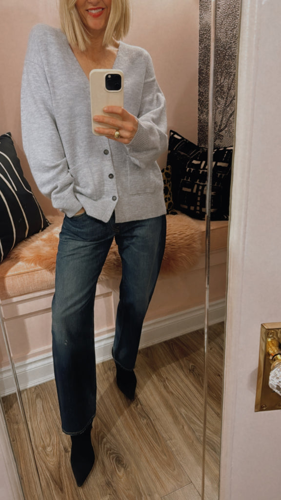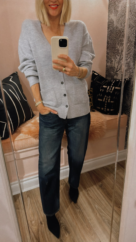 Oversized cardigan with two pockets, made in a fuzzy, bouncy knit.