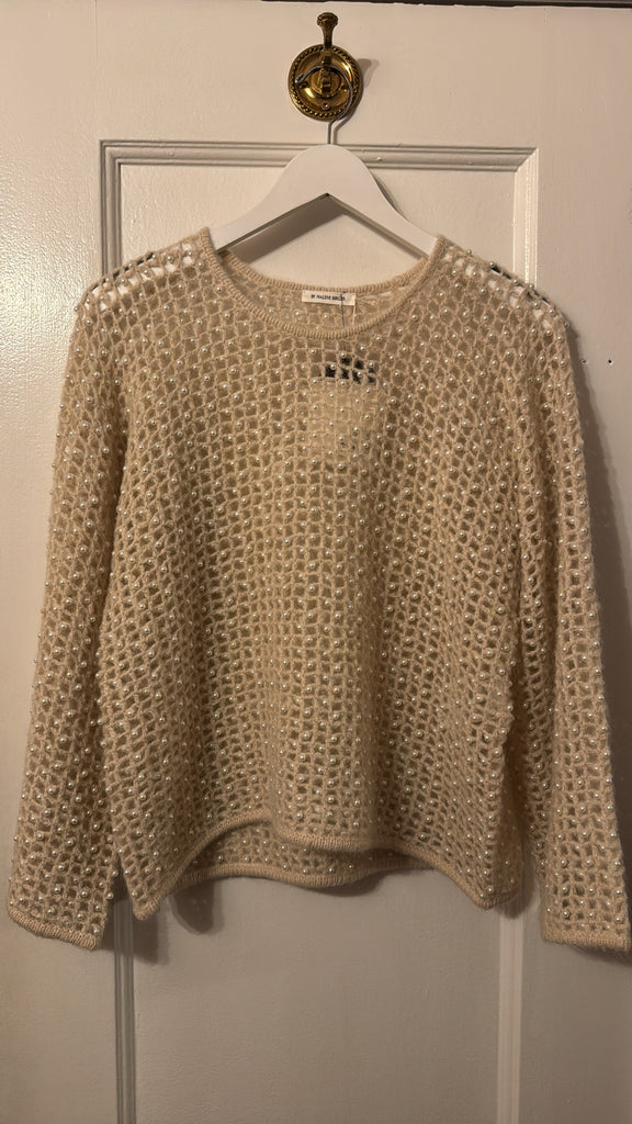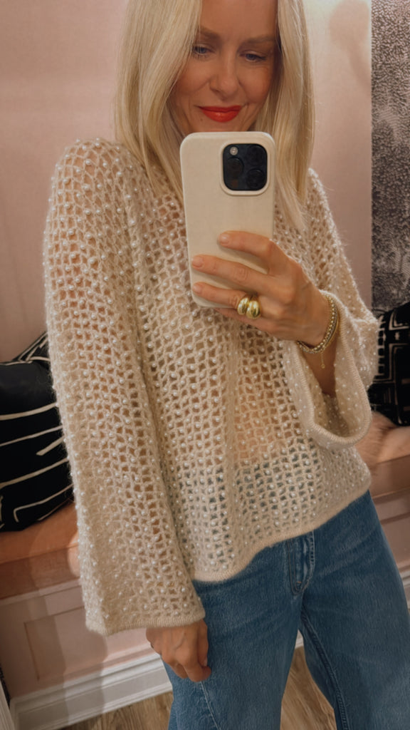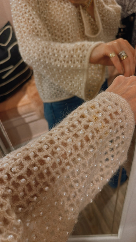 With its opaque wool mix knitted in a squared cut-out pattern and decorated with delicate faux pearls, the Amil sweater makes a lasting impression. The distinctive design creates a versatile layer to be worn across seasons.