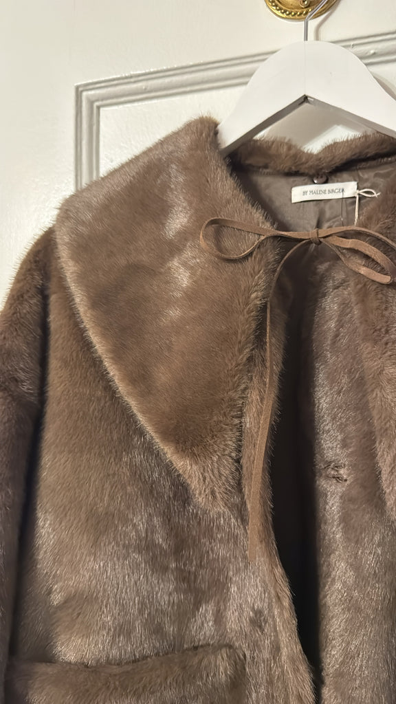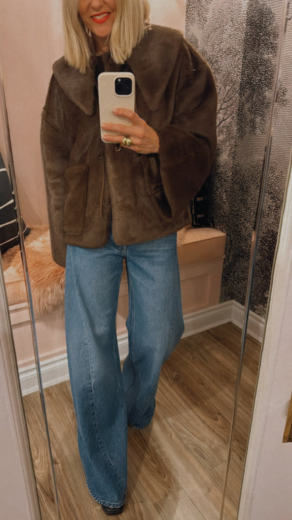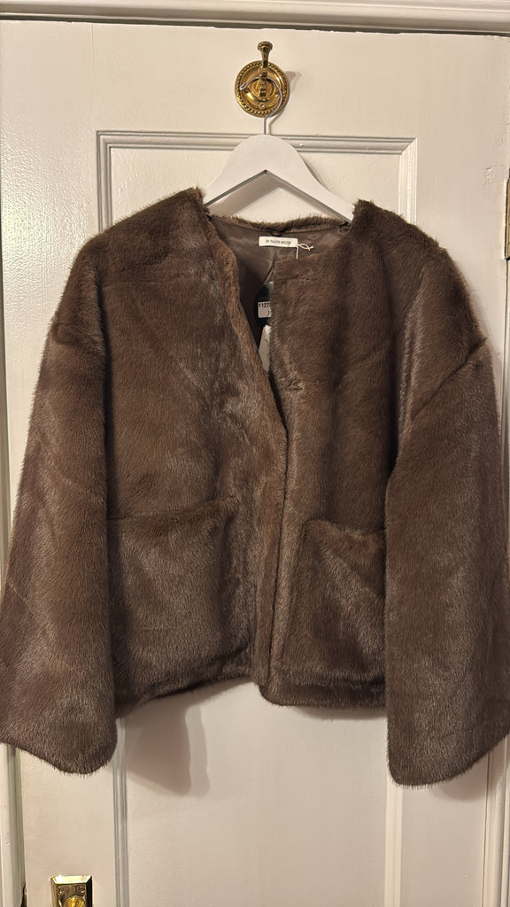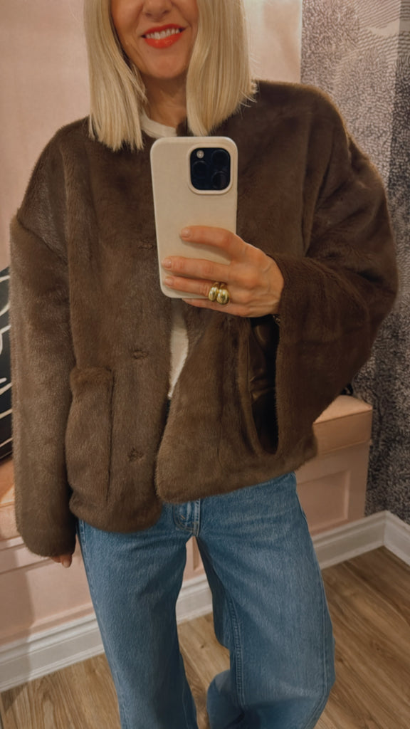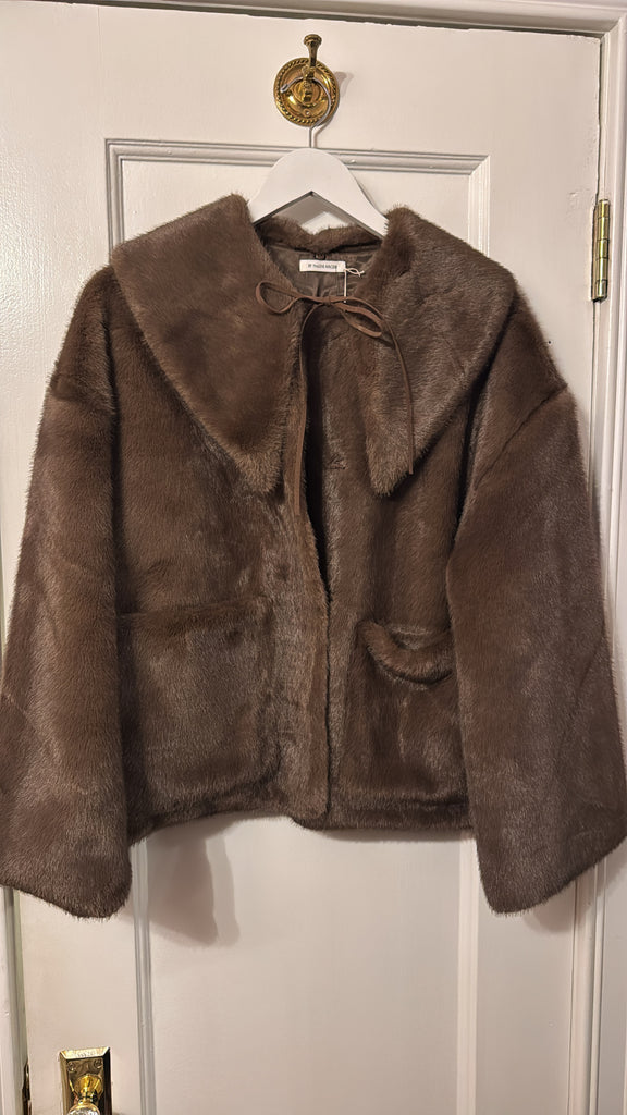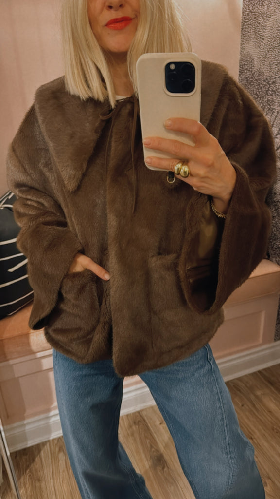 A snug and sophisticated jacket, such as the Jacquie design, is key to transition easily into the colder months. Fresh and feminine, the faux fur jacket features two large front pockets, a pointy collar, a charming necktie and hidden hook and clasp closures.